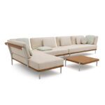 Flows unites a world of contrasts: limber yet strong, this collection features a light, elegant aluminum frame combined with the warmth of a handcrafted wood finish. Flows carefully balances old and new to give the pieces their defining characteristics. The unique shape of the oval legs turns the Flows sofas and loungers into one-of-a-kind pieces destined for long-lasting appreciation.