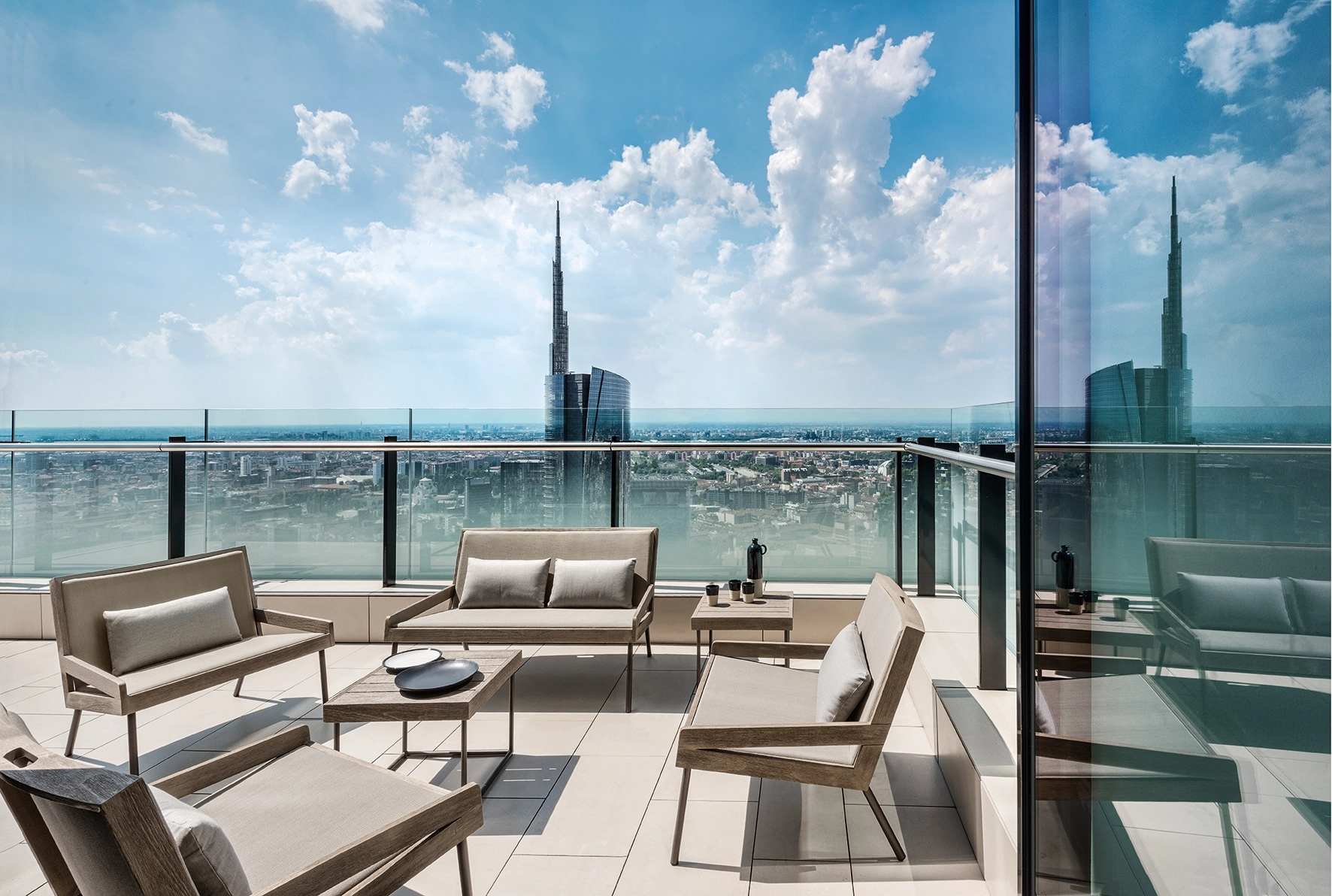 Furniture with a metal structure, elegant, upholstered with comfortable cushions in a waterproof, classic-style fabric, ideal for use in the most prestigious, exclusive hospitality locations.