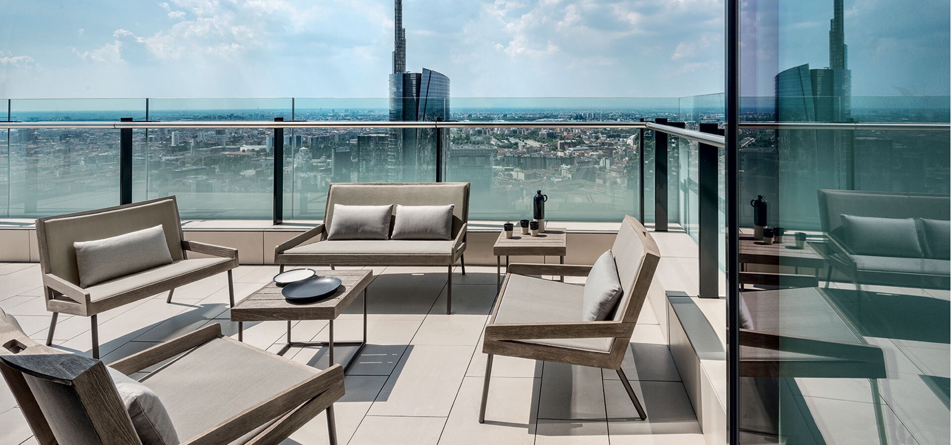 Allaperto Mountain Tartan collection proposes elements featuring a coffee-coloured metal structure clad in natural teak and Ethitex technical fabric with a tartan design.