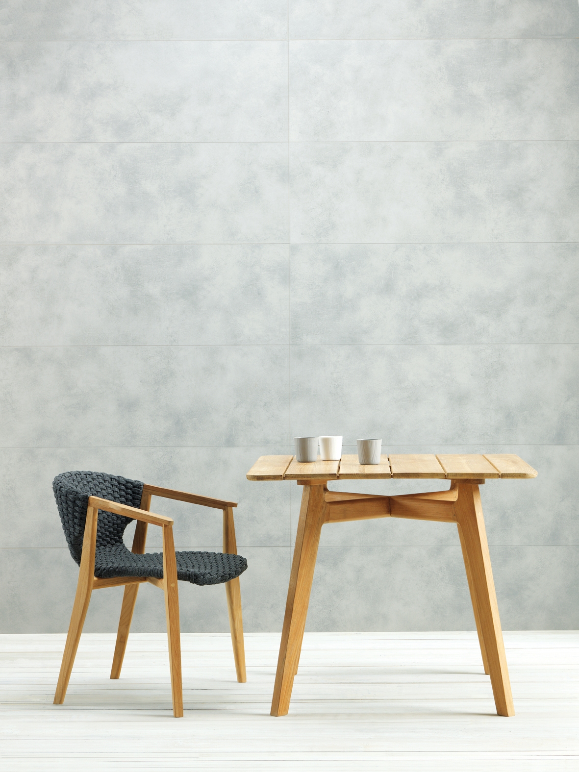 Knit is a complete line of tables, chairs and lounge chairs in teak and woven rope that expresses with refinement a perfect synthesis of aesthetics, functionality and ergonomics. The iconic collection is enriched by the new version in pickled teak and light gray rope and the rocking version of the lounge chair with high back, thus offering a new and special interpretation of the classic bergère.