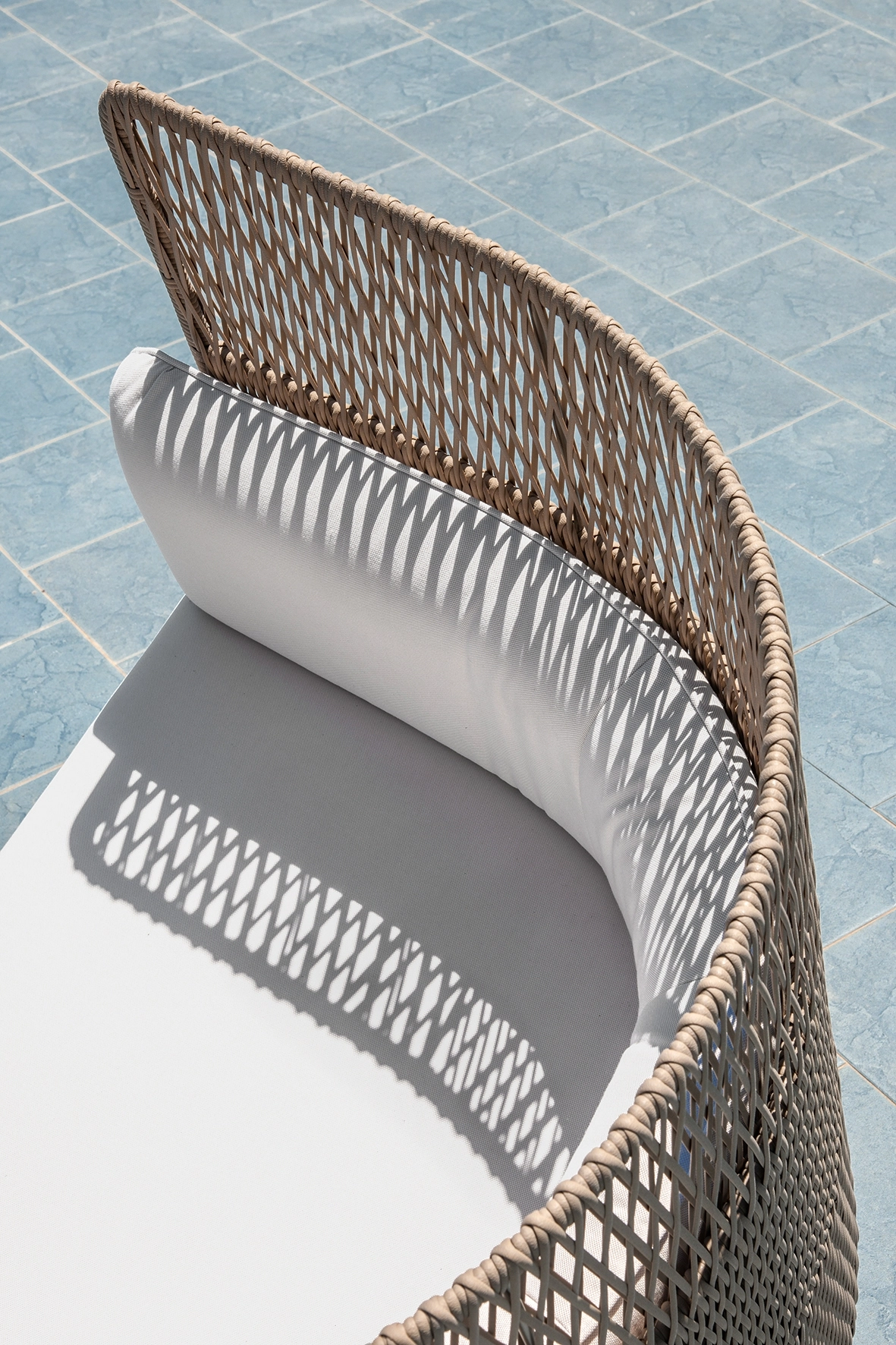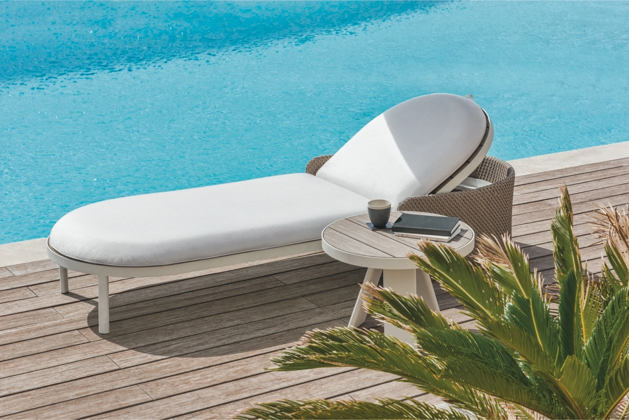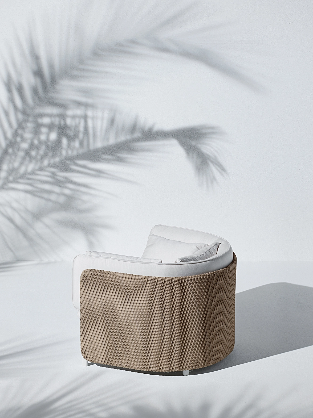 The union of aluminum and teak with synthetic fibre made using a special technology that recreates artisan sensations and has the warmth typical of natural woven fibre leads to refined, welcoming solutions that suggest relaxation and wellbeing.