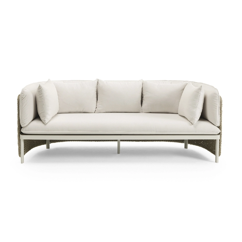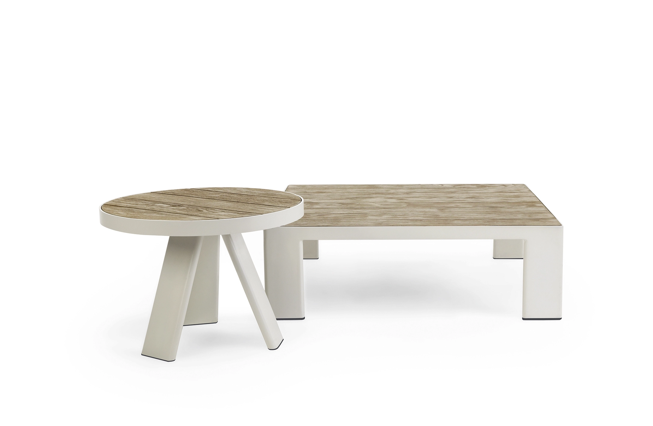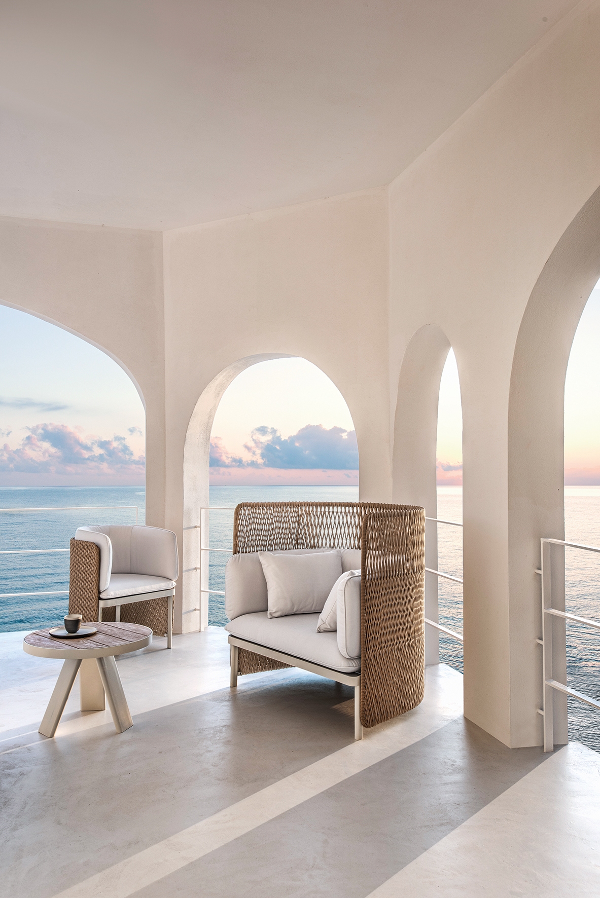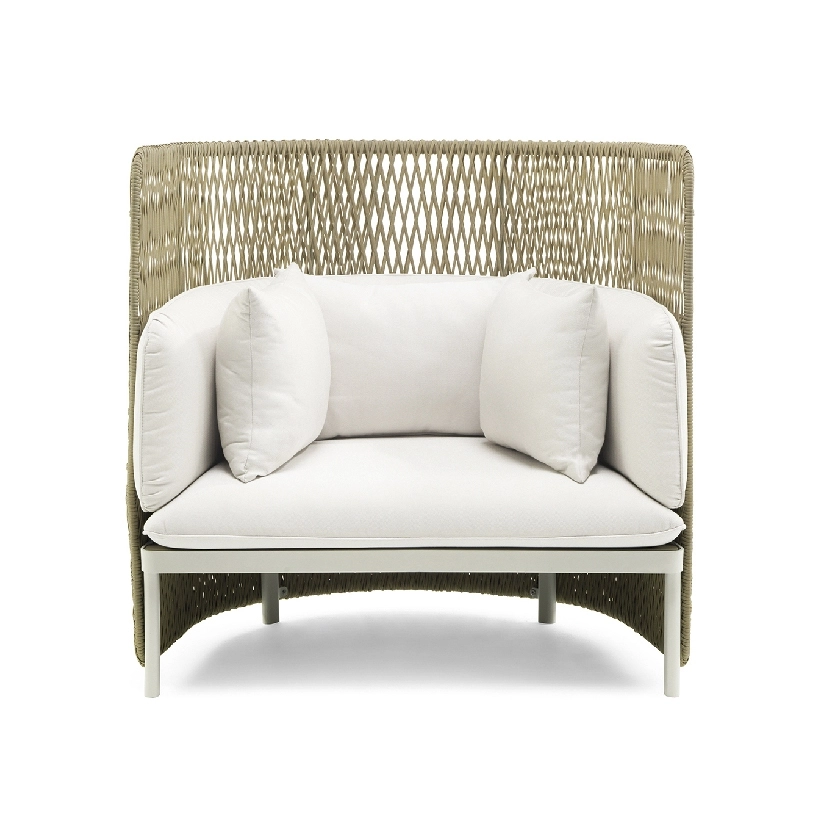 The union of aluminum and teak with synthetic fibre made using a special technology that recreates artisan sensations and has the warmth typical of natural woven fibre leads to refined, welcoming solutions that suggest relaxation and wellbeing.