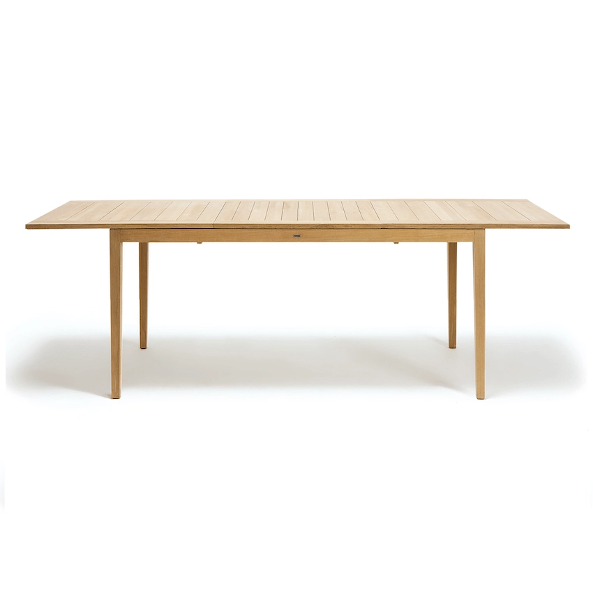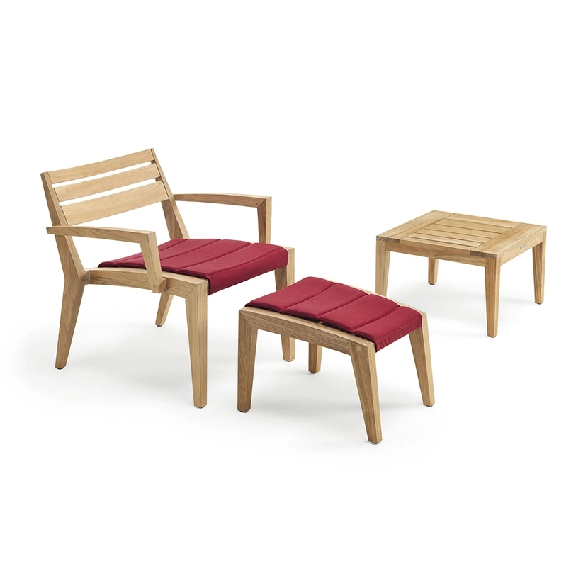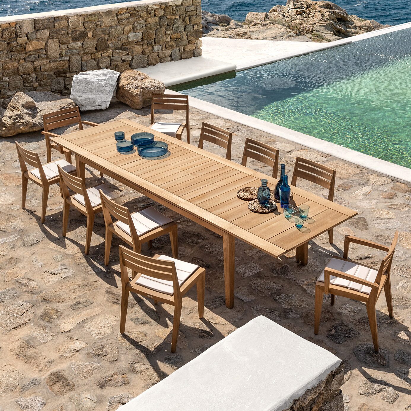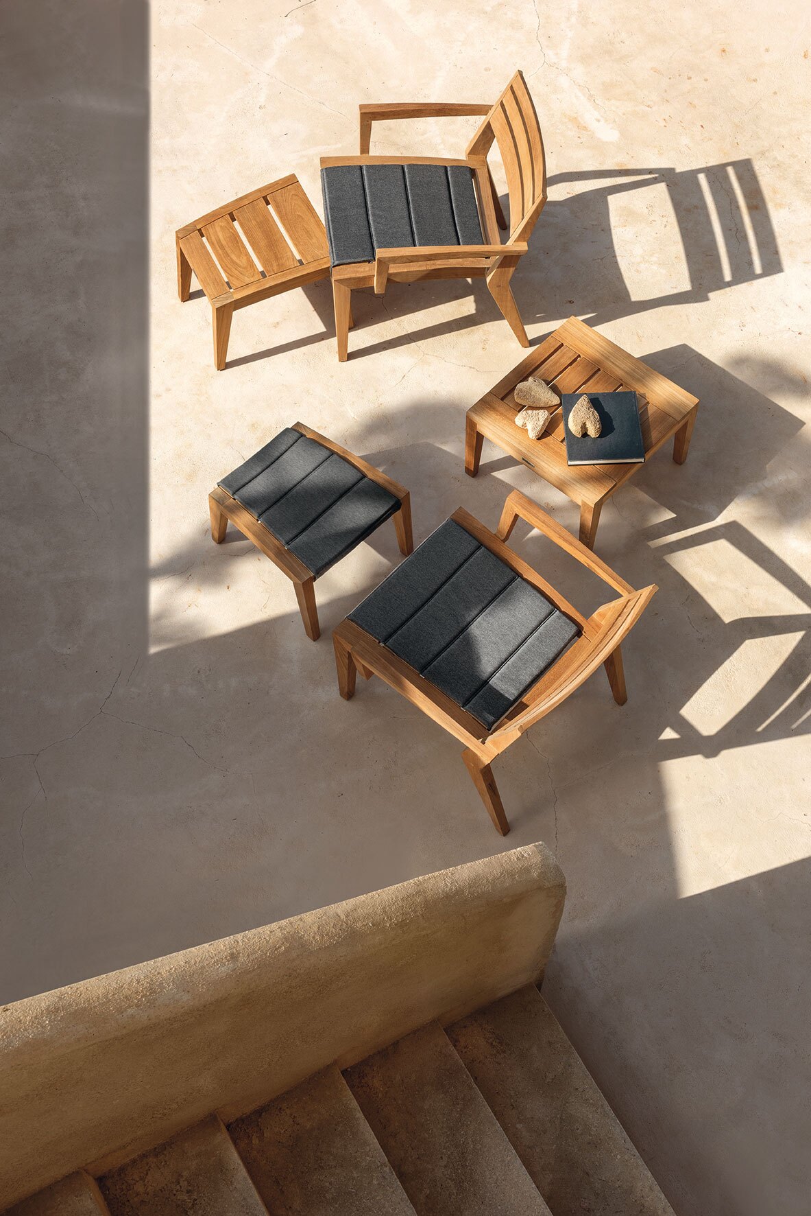 Ribot, the collection made entirely from solid teak, featuring dining chairs, lounge armchairs, footstools, coffee table and extendable table, now stars a tall stool with backrest.