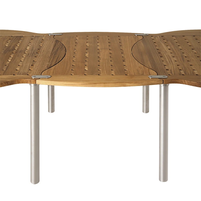 An artistic blend of geometric lines and fluid curves, the Fifty Five collection features a nautically inspired hatch top joinery of burnished teak for exceptional resilience and stability. Paired with our solid teak Matchmaker, it is possible to connect multiple Fifty Five tables as a solution for large gatherings. The tables stack for convenient storage.