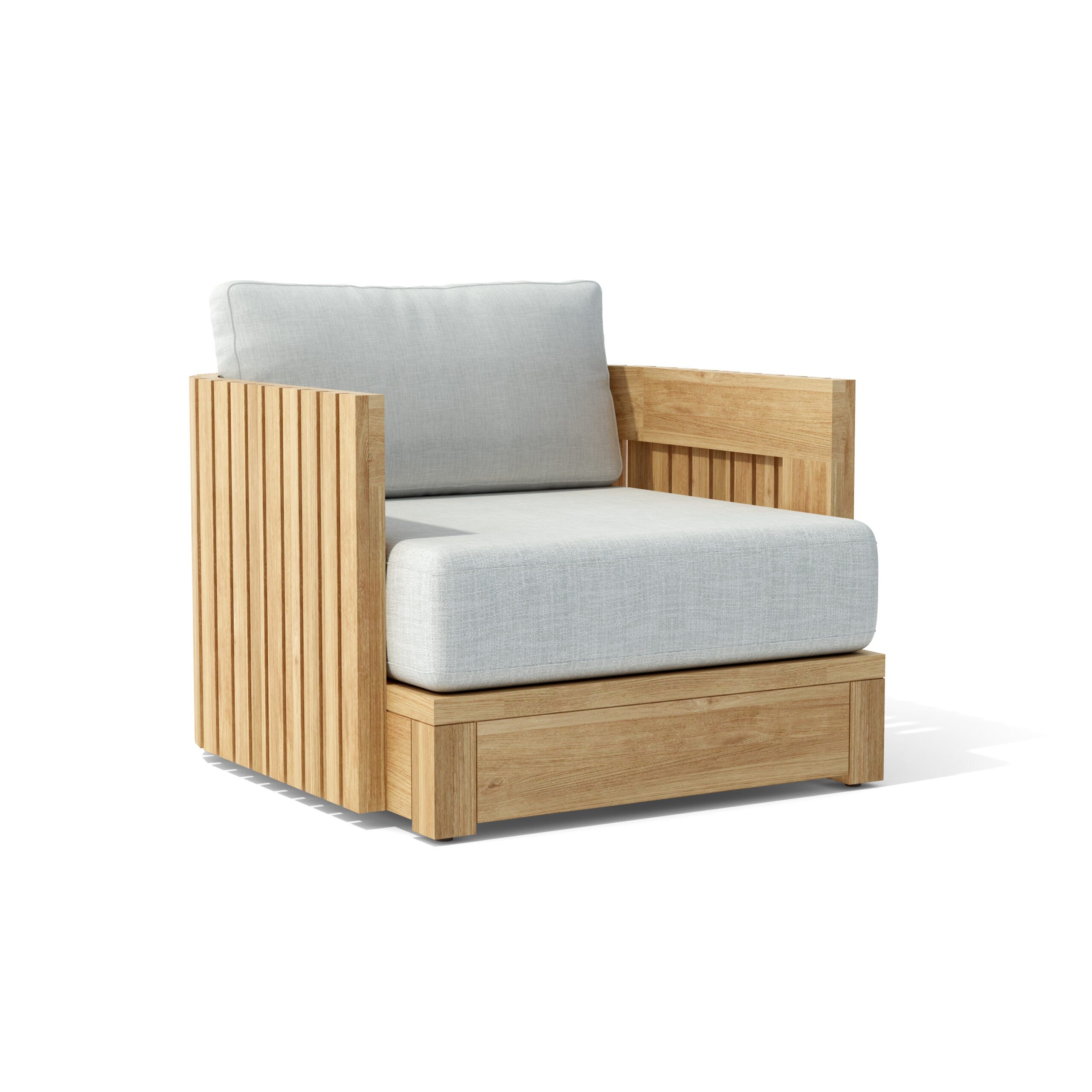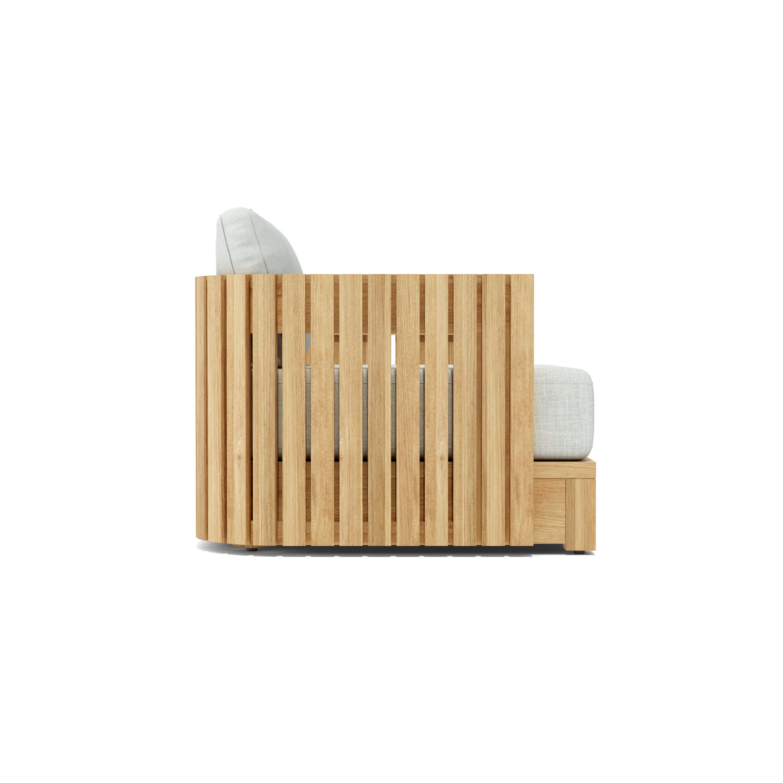 The Bay collection exudes sophistication, elevating any outdoor space with its curved design. Meticulously fashioned from high-quality solid teak, every piece is adorned with striking vertical wooden slats, thoughtfully crafted to effortlessly complement the collection’s bold contours. Delight in unmatched comfort and durability with the generously-sized seat cushions, fashioned from exquisite performance fabrics by Giati Elements.
