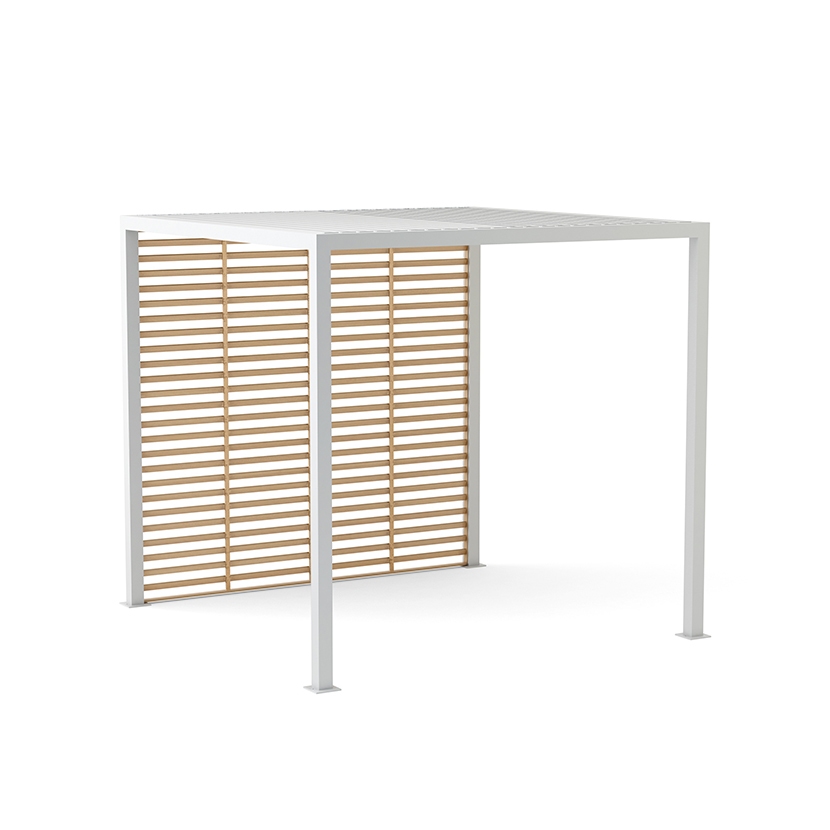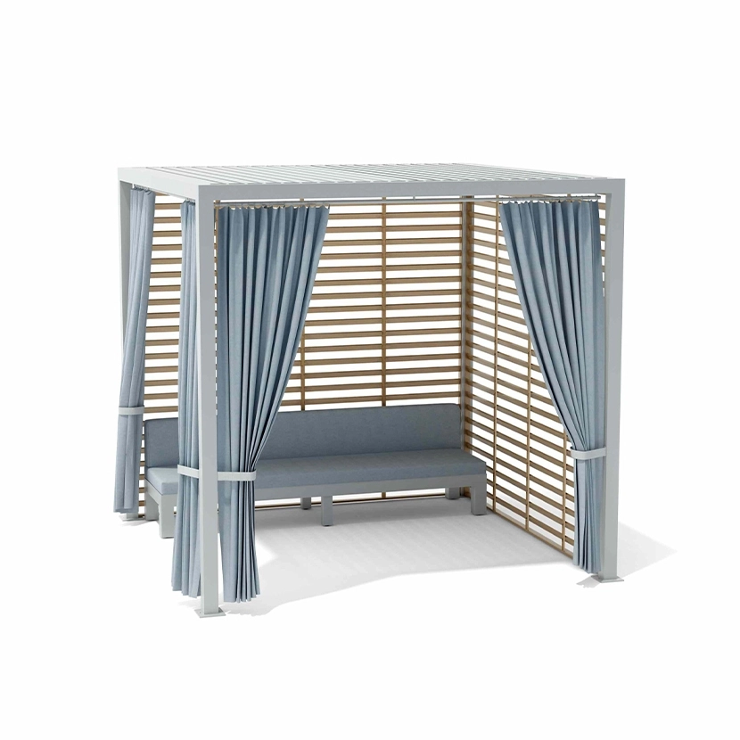Two options available for walls; Aluminum Slats and/or Fabric Curtains. This pavilion can be custom configured to have up to 3 slat walls and/or drapery on all 4 sides