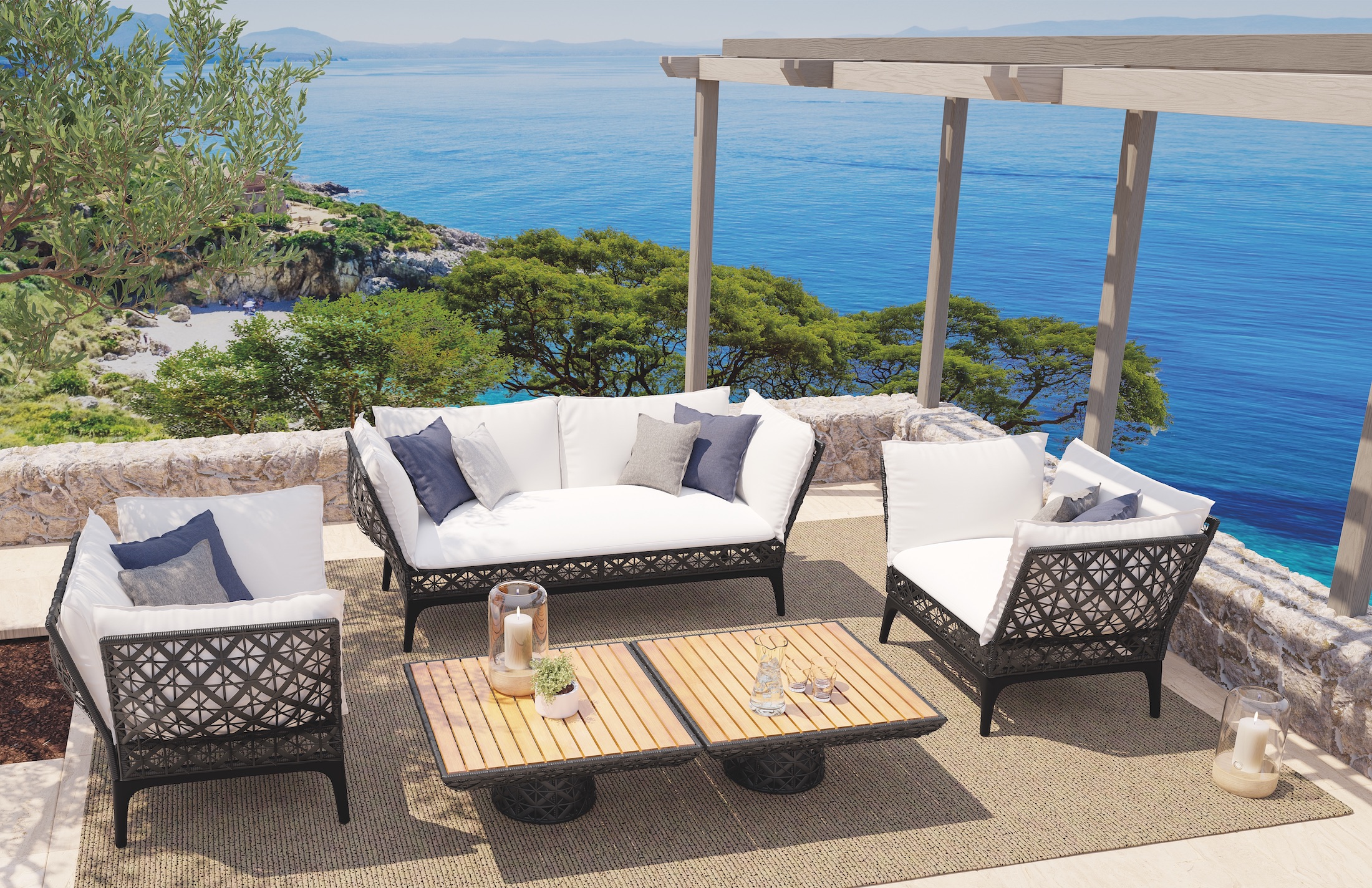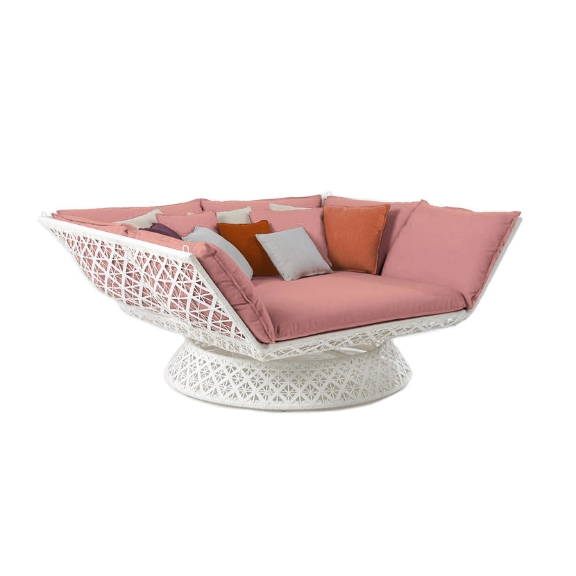 With its ornamented pattern, the pieces can be customized while pillows create a cozy atmosphere. Side tables and coffee tables complete this set that envelopes people in modern tranquility while offering them a sense of security and the freedom to dream.