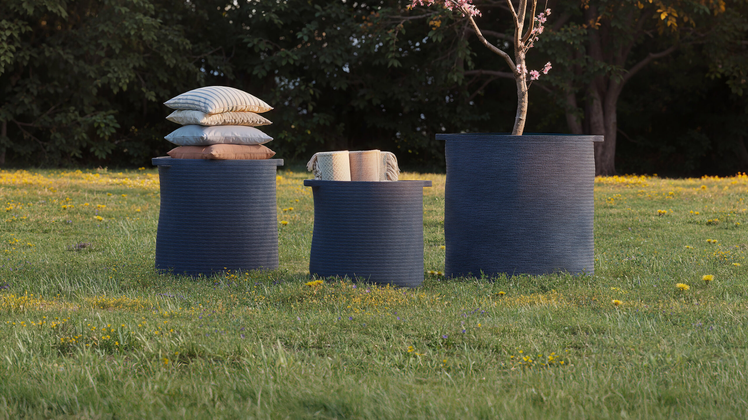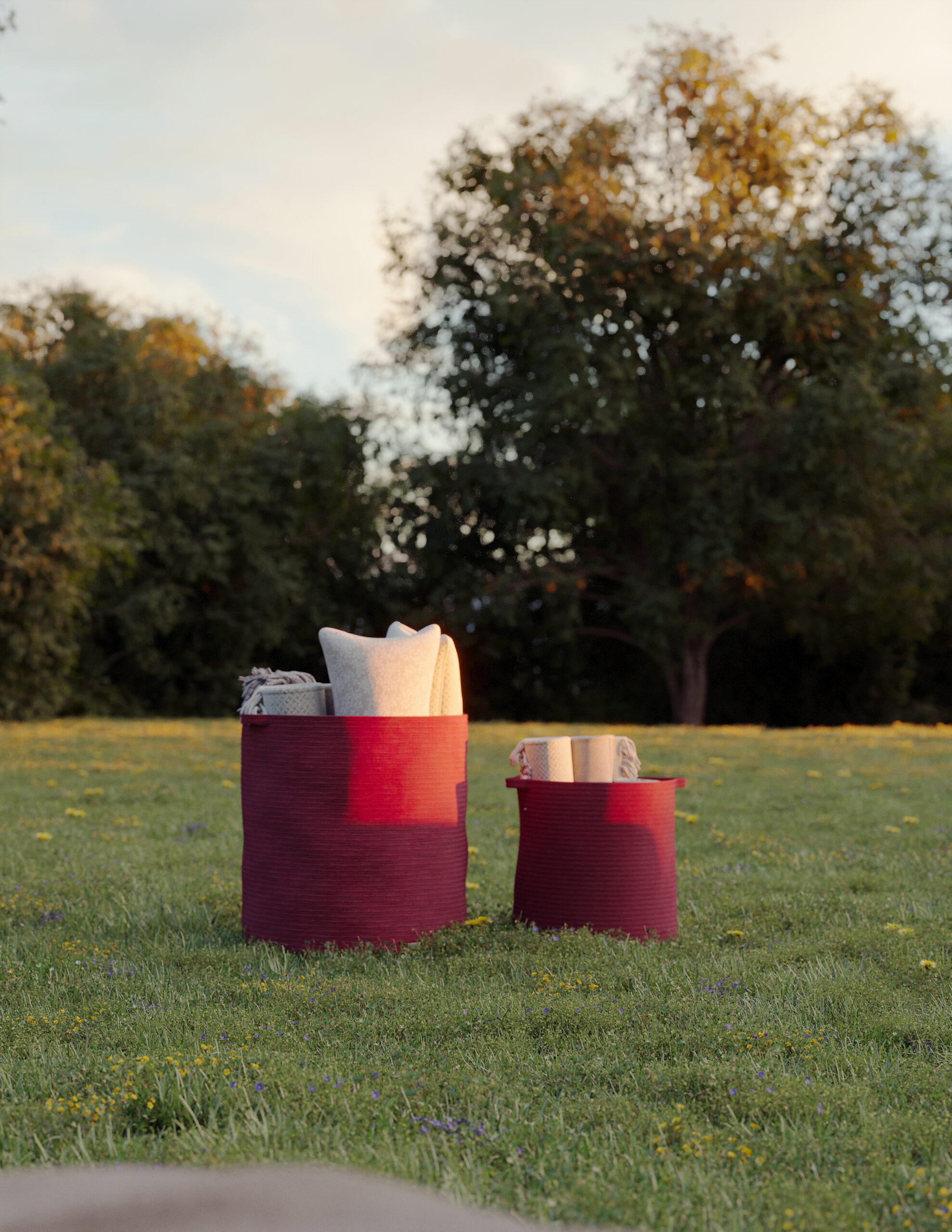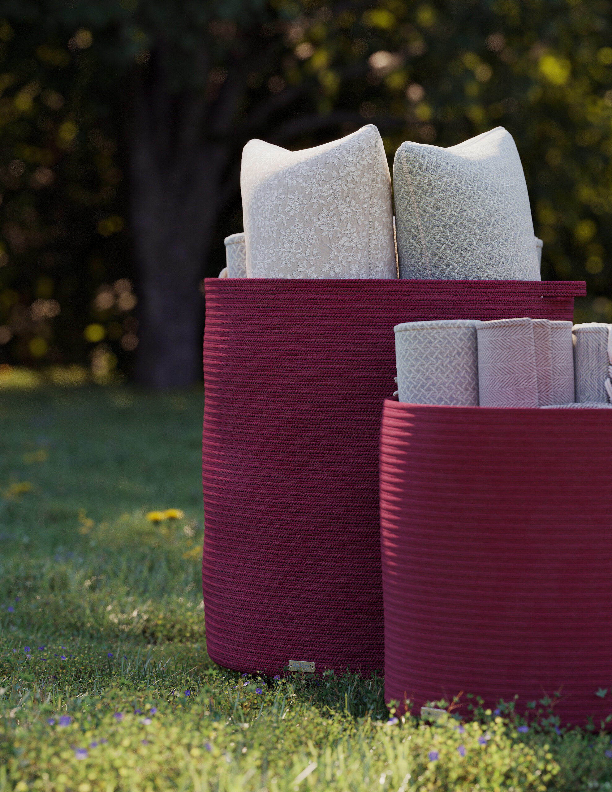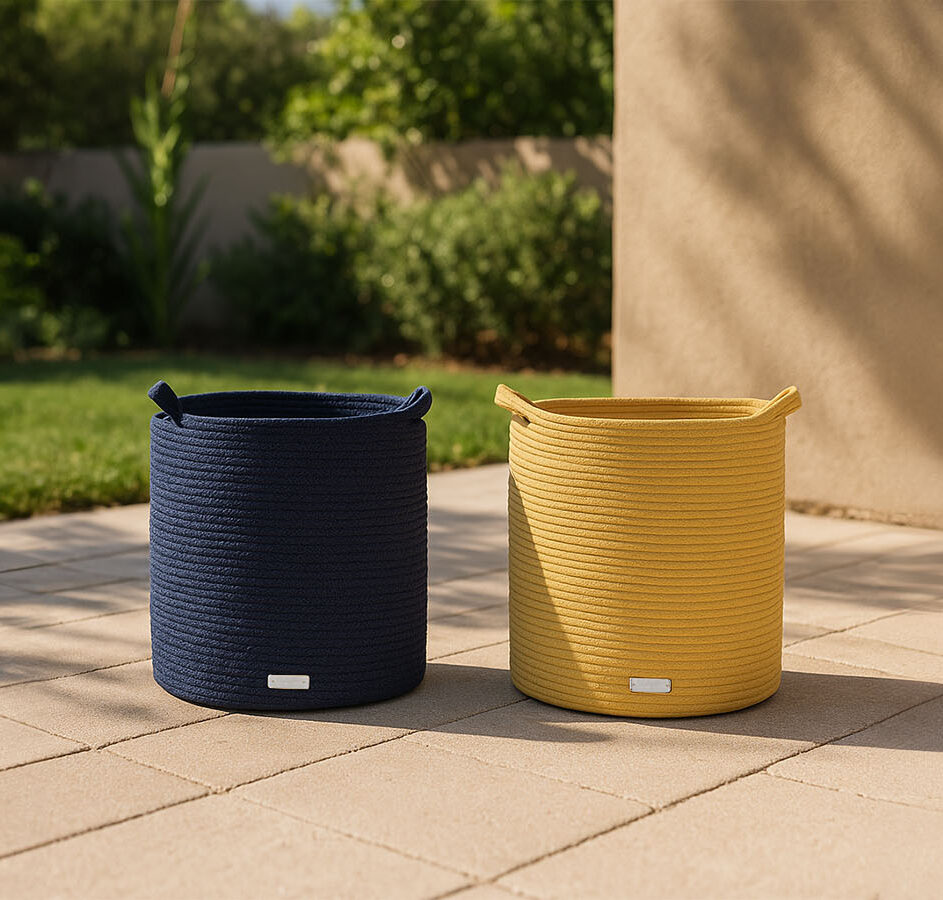 Crafted from durable flat rope, the Sullivan baskets offer a perfect blend of form and function for outdoor living. Featuring a modern cylindrical silhouette and integrated handles, these baskets are ideal for holding rolled towels poolside, on the patio, or in a garden cabana. Available in a variety of colors, the woven texture brings a tactile, relaxed charm to your outdoor space. Stylish yet sturdy, the Sullivan baskets are a versatile storage solution designed to withstand the elements while enhancing your alfresco aesthetic.