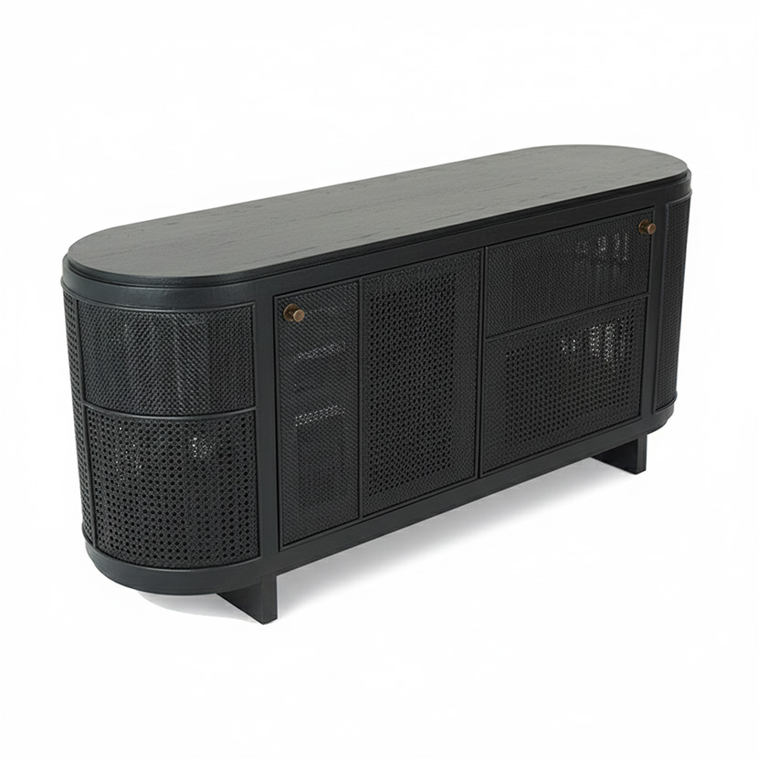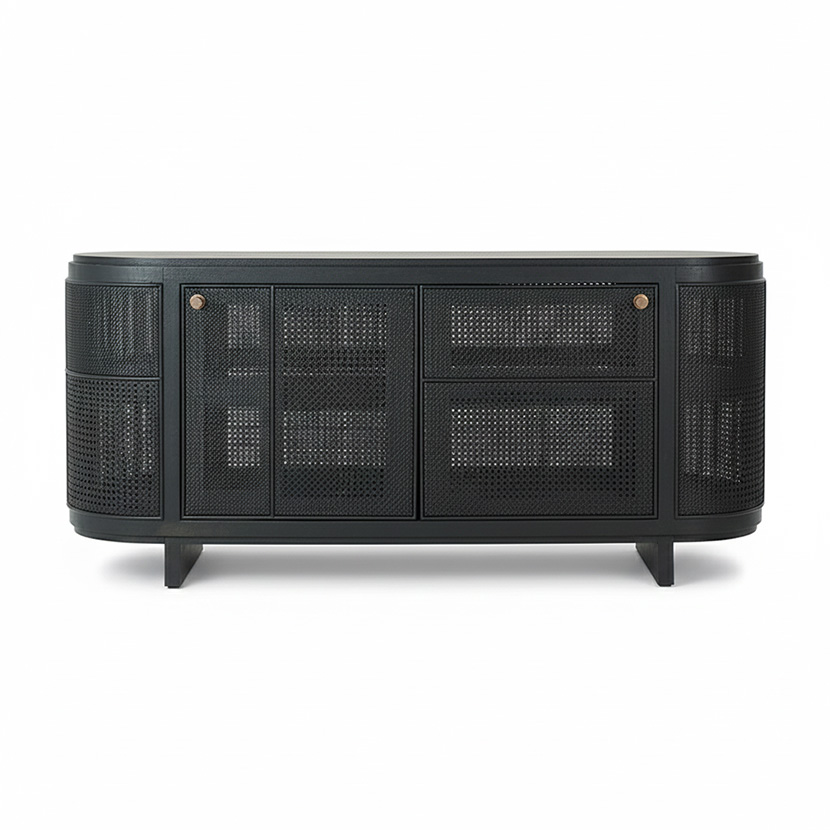 - Mahogany wood surfaces with accents in hand-woven rattan to add texture and visual interest
