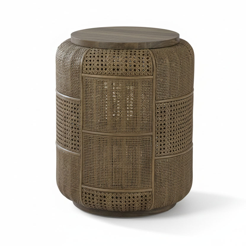 - Mahogany wood surfaces with accents in hand-woven rattan to add texture and visual interest