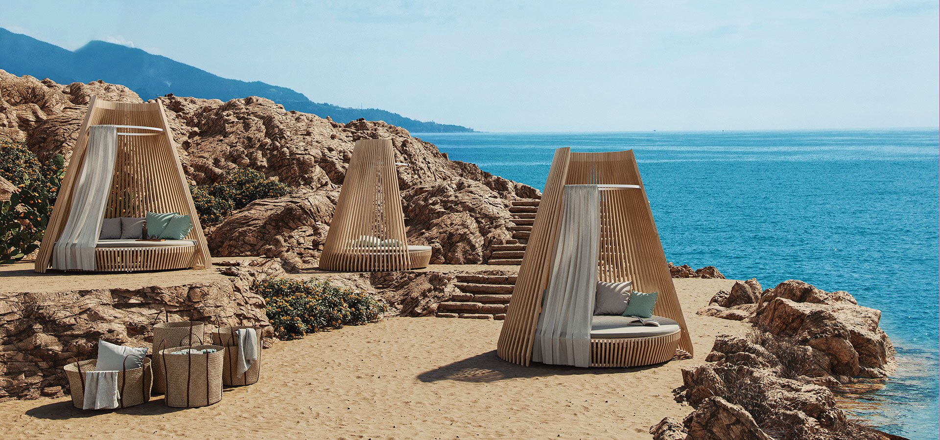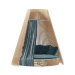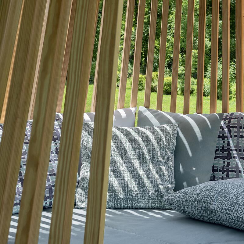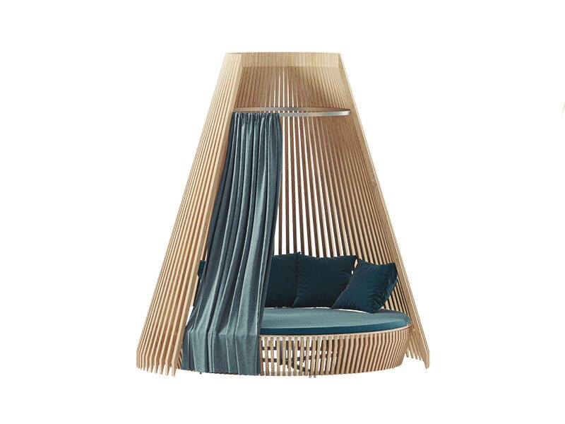 Hut is a welcoming and comfortable nest, where you can relax in harmony with nature. The long ‘stems’ of the structure reproduce the shapes of a tepee, while the metal inserts and details define the large seat, covered with soft cushions. Hut is a wellbeing project with a contemporary and ecofriendly soul. The external “shell”, like the large lounge bed, are made of Siberian Larcie or Accoya®, a solid and high-performance wood, FSC certified. This innovative type of wood is obtained through non-toxic treatments of the raw material, which allow to maintain the versatility and appearance of the original material, ensuring exceptional stability, durability and resistance, while respecting the environment. Hut has no restrictions on the ground, it can be moved and customized with an elegant curtain, which allows you to ‘close’ the nest, ensuring a constant and pleasant passage of air and protecting from direct sunlight.