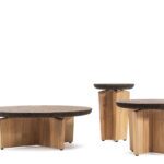 Cross low tables have bases and tops in natural materials, such as FSC teak and, which is given its colour, texture and durability by a special 100% eco-friendly treatment.