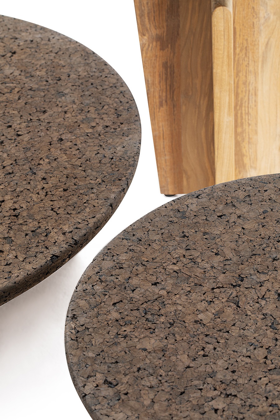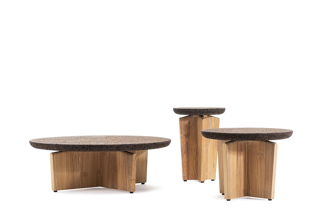 Cross low tables have bases and tops in natural materials, such as FSC teak and, which is given its colour, texture and durability by a special 100% eco-friendly treatment.