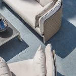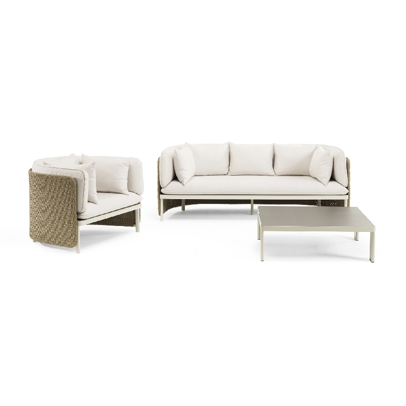 The union of aluminum and teak with synthetic fibre made using a special technology that recreates artisan sensations and has the warmth typical of natural woven fibre leads to refined, welcoming solutions that suggest relaxation and wellbeing.
