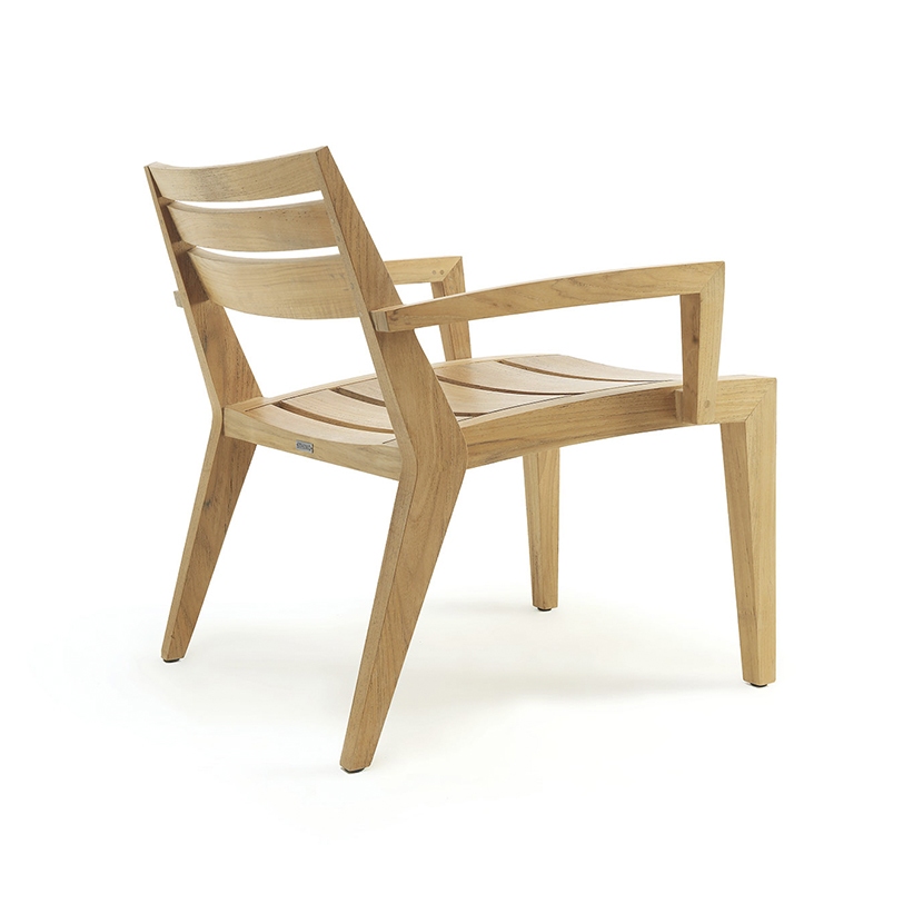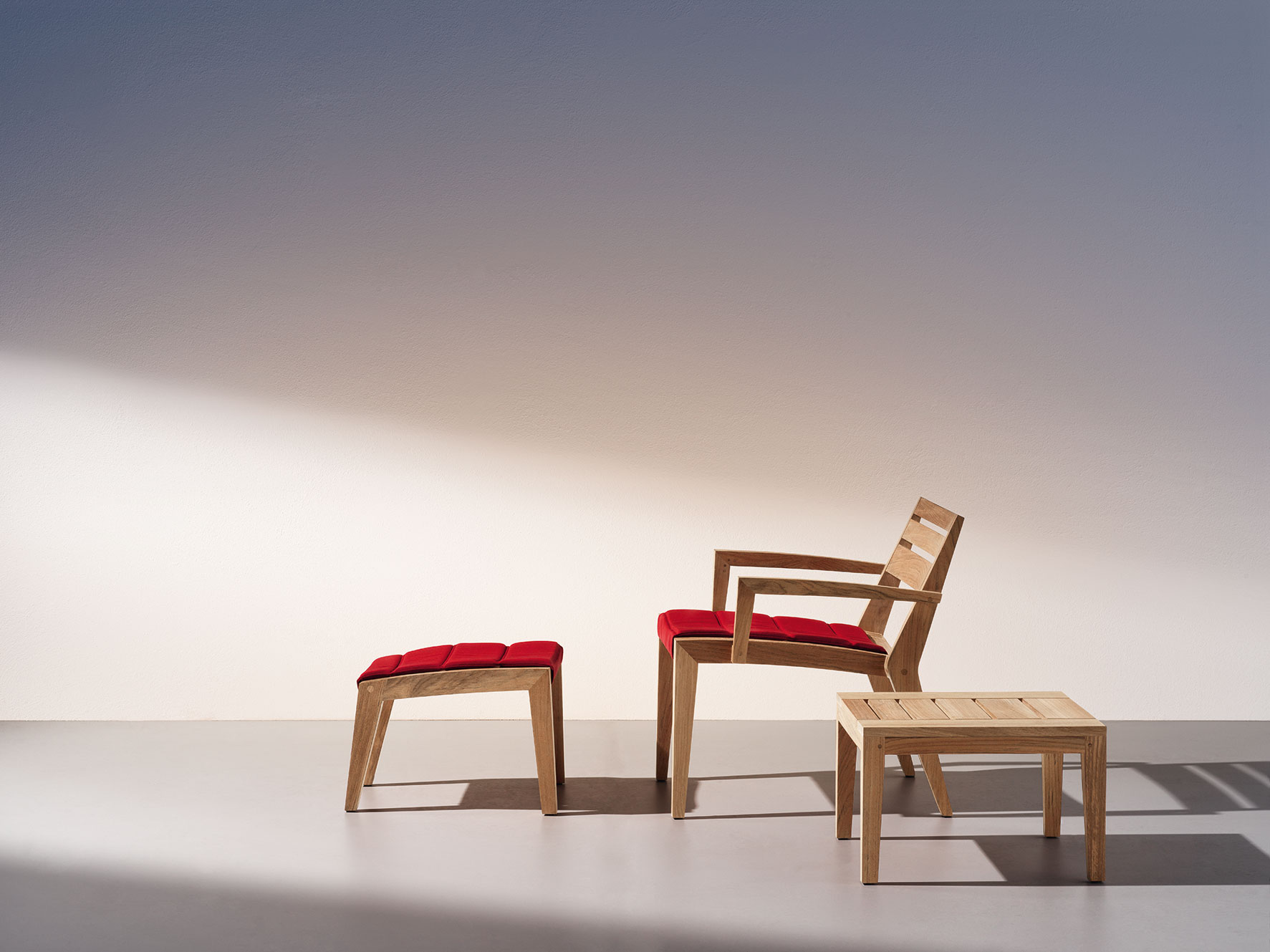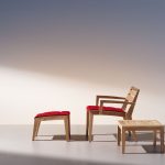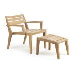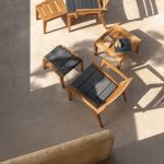 Ribot, the collection made entirely from solid teak, featuring dining chairs, lounge armchairs, footstools, coffee table and extendable table, now stars a tall stool with backrest.