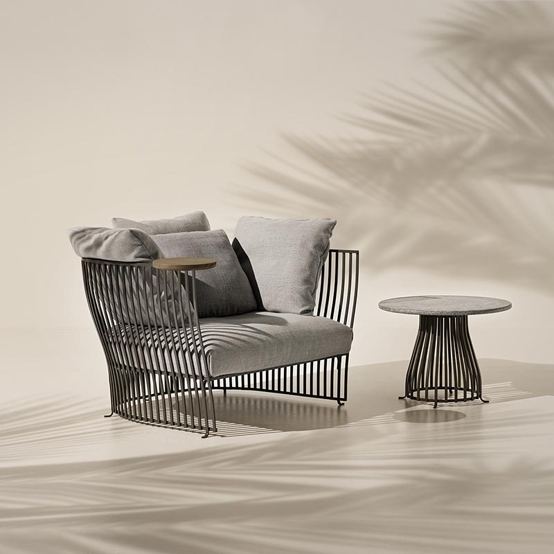 The elegance of the urban furniture of the late nineteenth century relives in a project that combines timeless charm and modern functionality. The aluminum structure that visually recalls the ancient railings, characterizes the sofas and the armchair, enveloping the generous and rounded forms of the seat with a feeling of lightness and robustness at the same time.