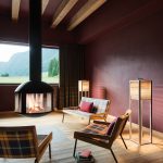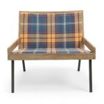 Allaperto Mountain Tartan collection proposes elements featuring a coffee-coloured metal structure clad in natural teak and Ethitex technical fabric with a tartan design.