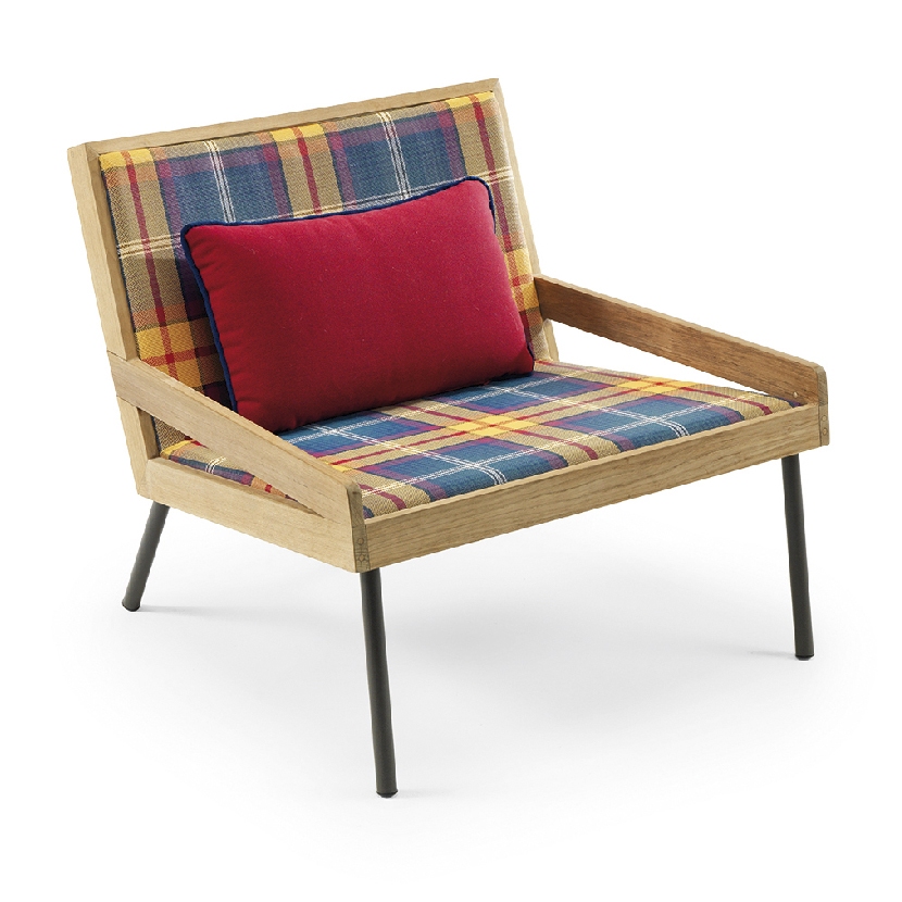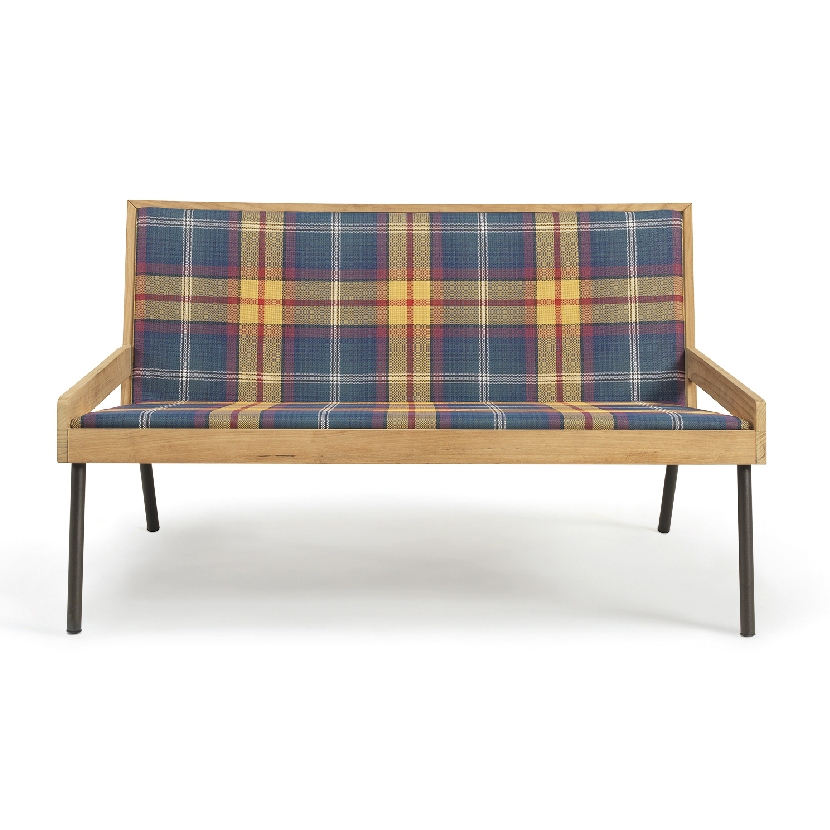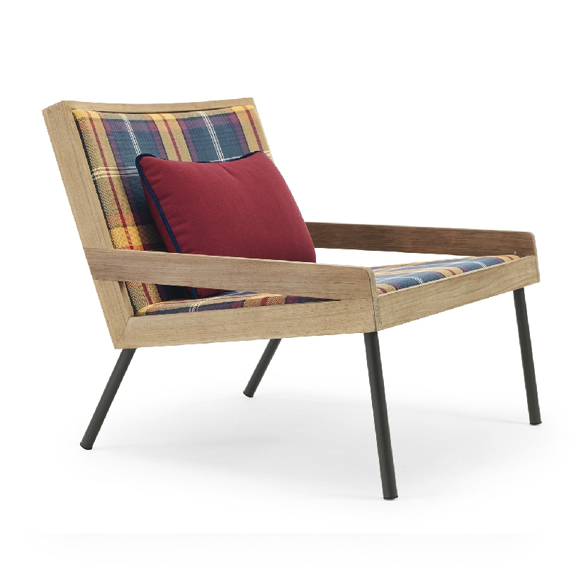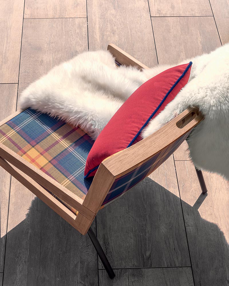 Allaperto Mountain Tartan collection proposes elements featuring a coffee-coloured metal structure clad in natural teak and Ethitex technical fabric with a tartan design.