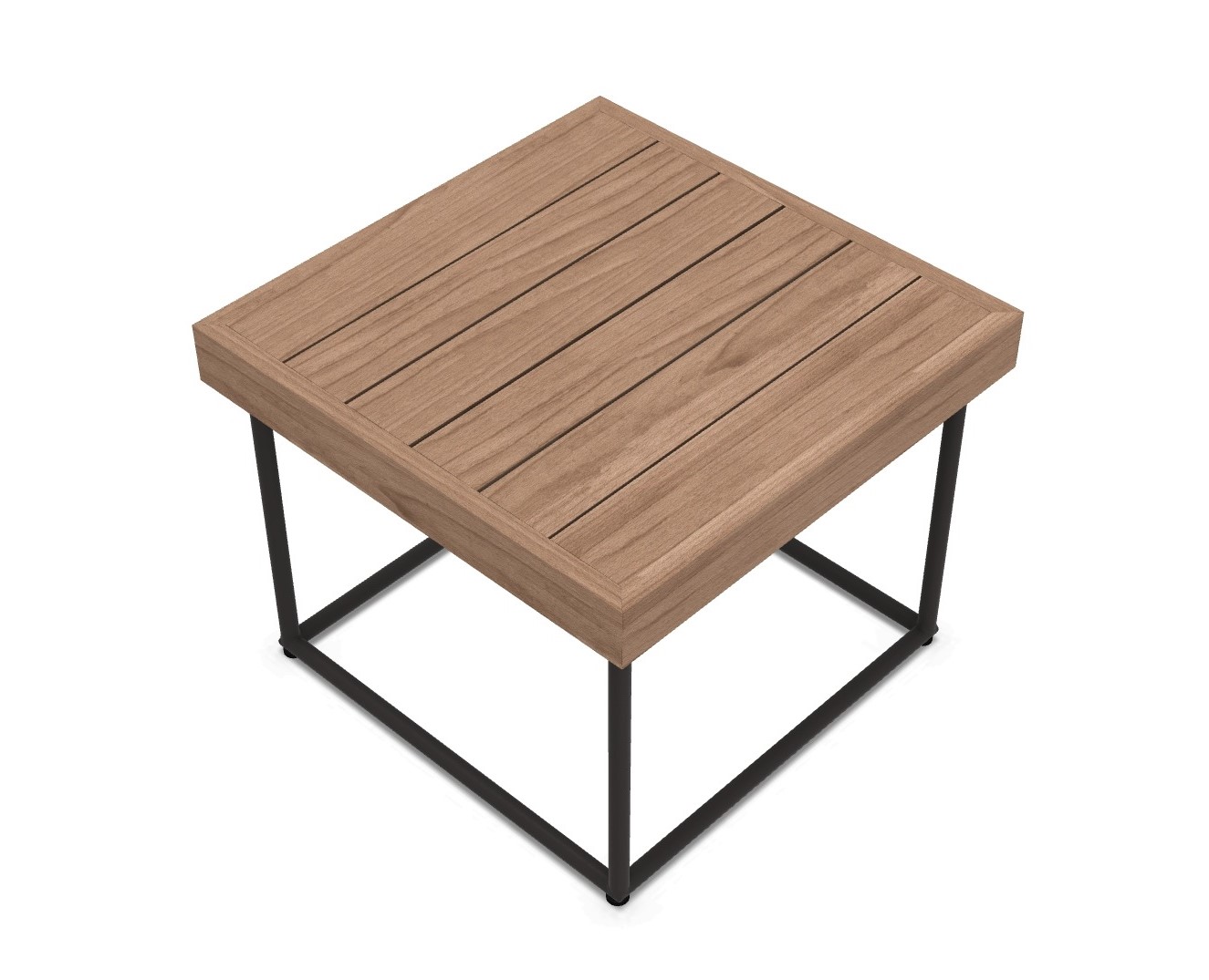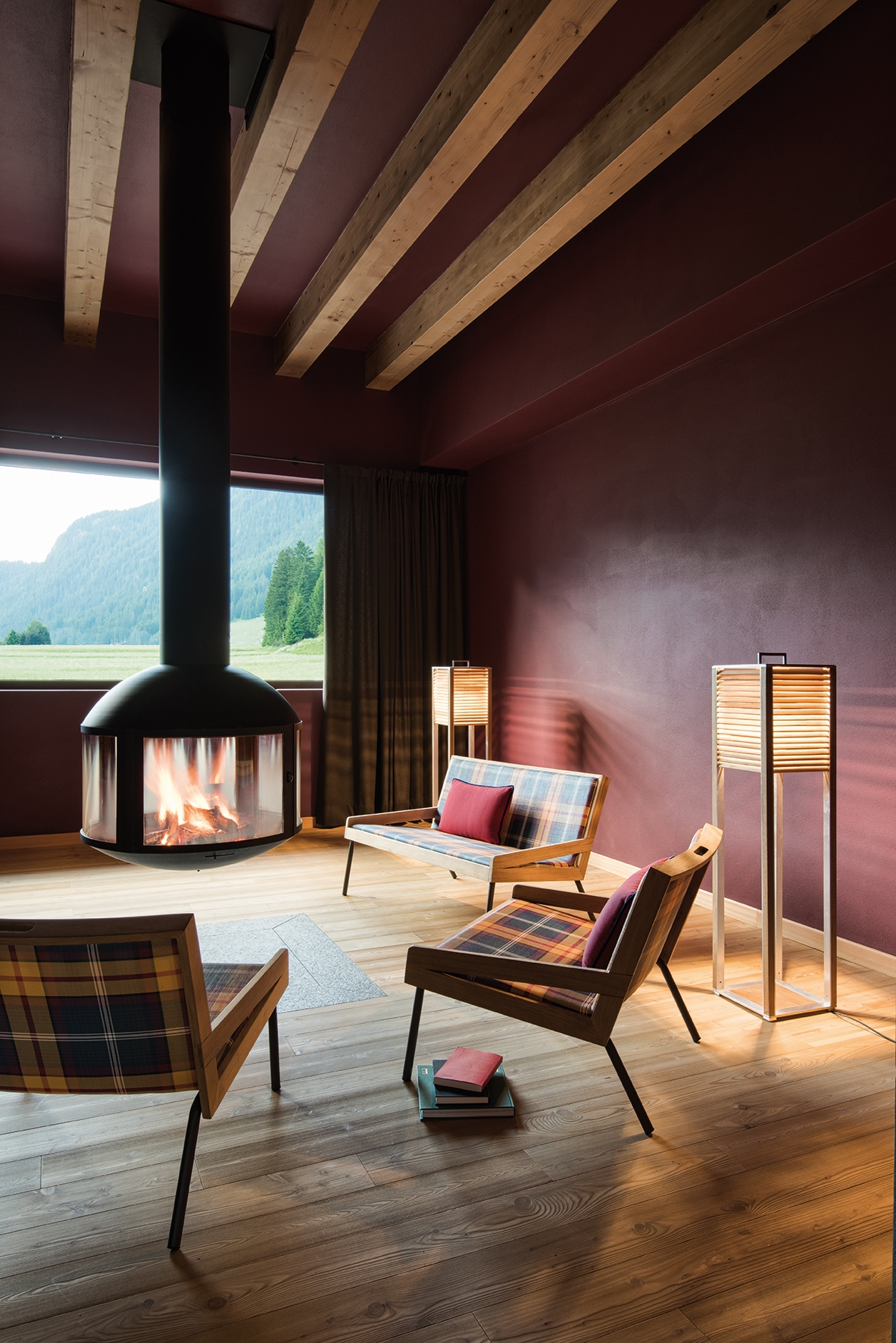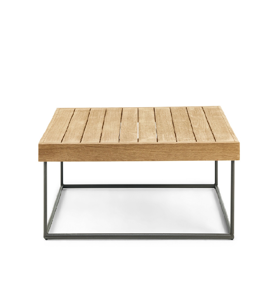 Allaperto Mountain Tartan collection proposes elements featuring a coffee-coloured metal structure clad in natural teak and Ethitex technical fabric with a tartan design.