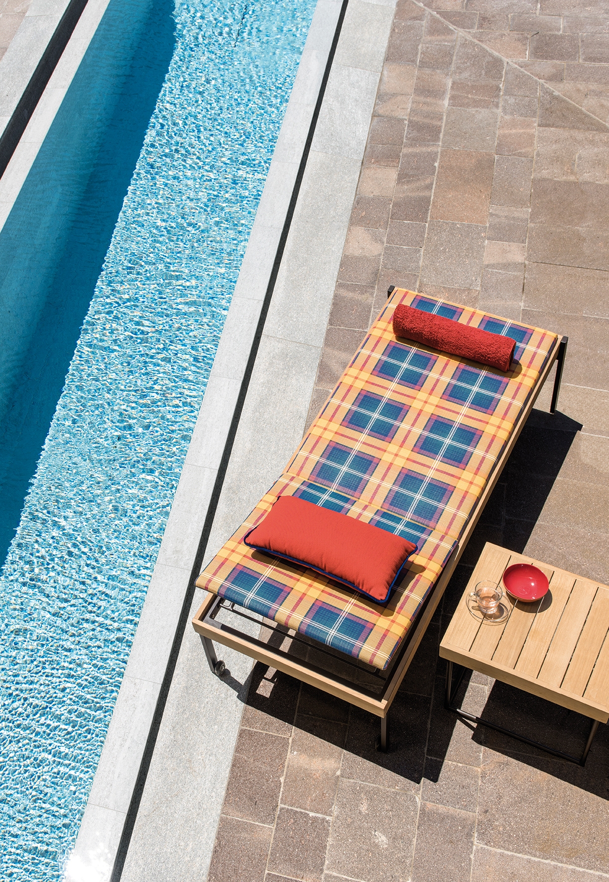 Allaperto Mountain Tartan collection proposes elements featuring a coffee-coloured metal structure clad in natural teak and Ethitex technical fabric with a tartan design.
