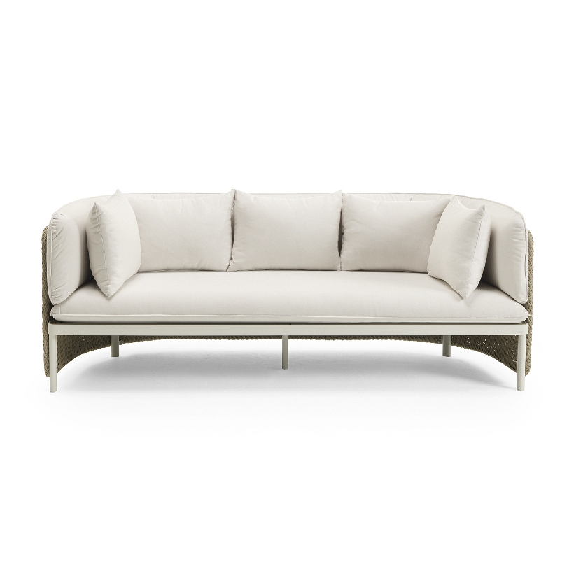 The collection Esedra takes its name from this element of classical architecture to create a complete range of furniture for a contemporary outdoor look, establishing a relationship between the various materials, such as the synthetic fiber used for the seat-backs, treated with a technology that recreates the sensation of natural woven fiber, the fabric upholstery of the cushions and the aluminium legs.