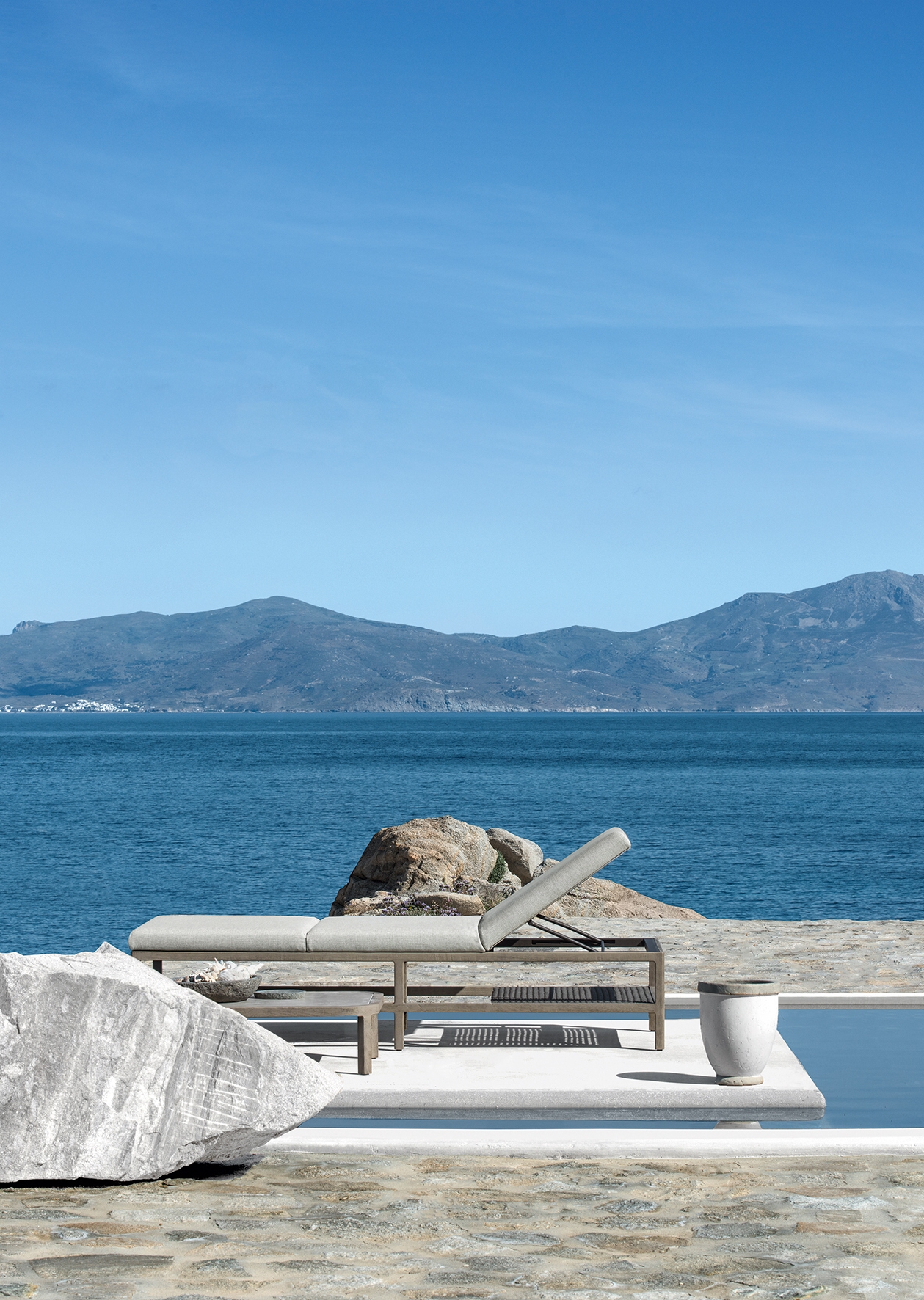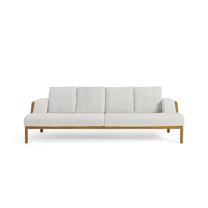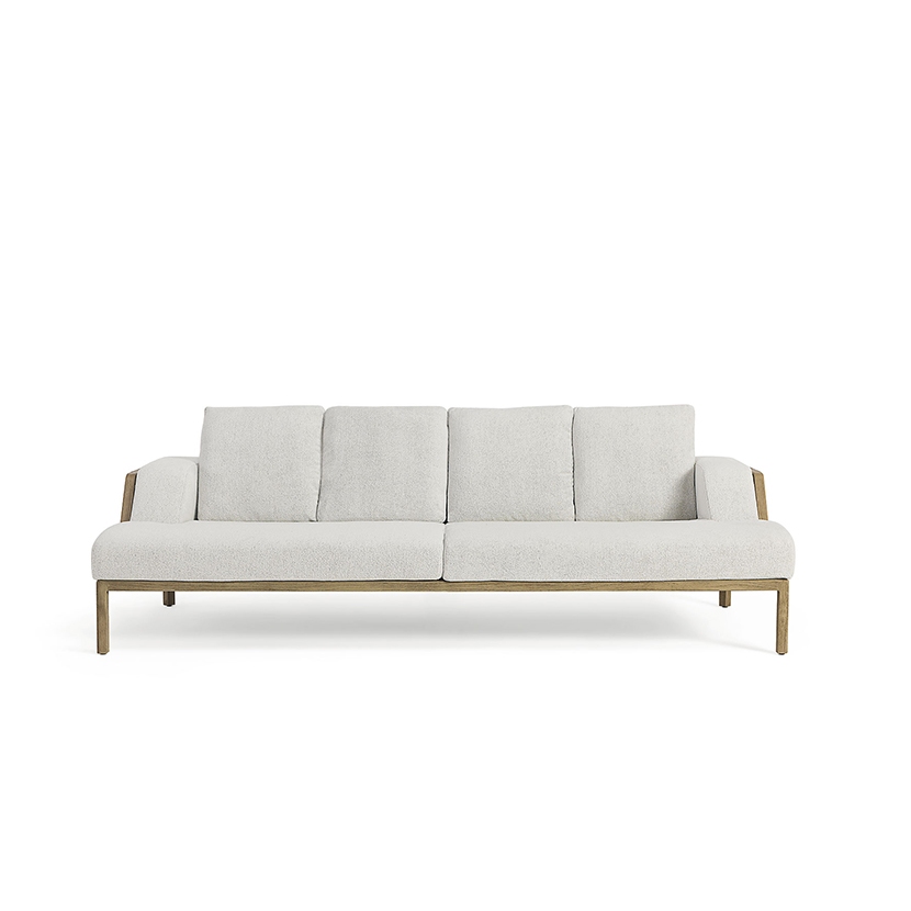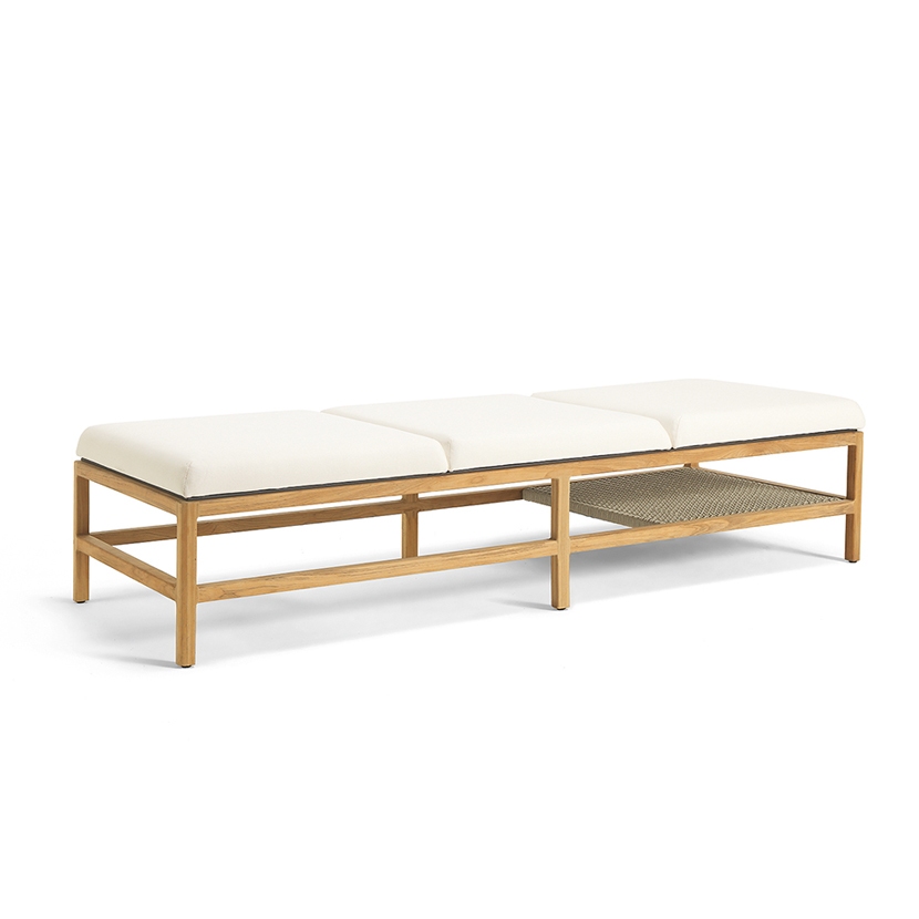 A collection of lounge chairs destined for large and prestigious outdoor spaces. The pickled or natural teak structure with metal core is covered with large cushions that welcome the body with a feeling of deep and enveloping comfort.