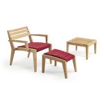 Ribot, the collection made entirely from solid teak, featuring dining chairs, lounge armchairs, footstools, coffee table and extendable table, now stars a tall stool with backrest.