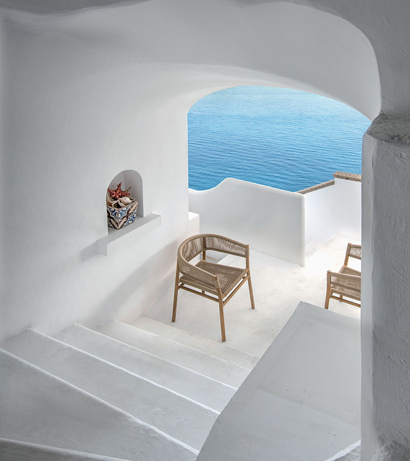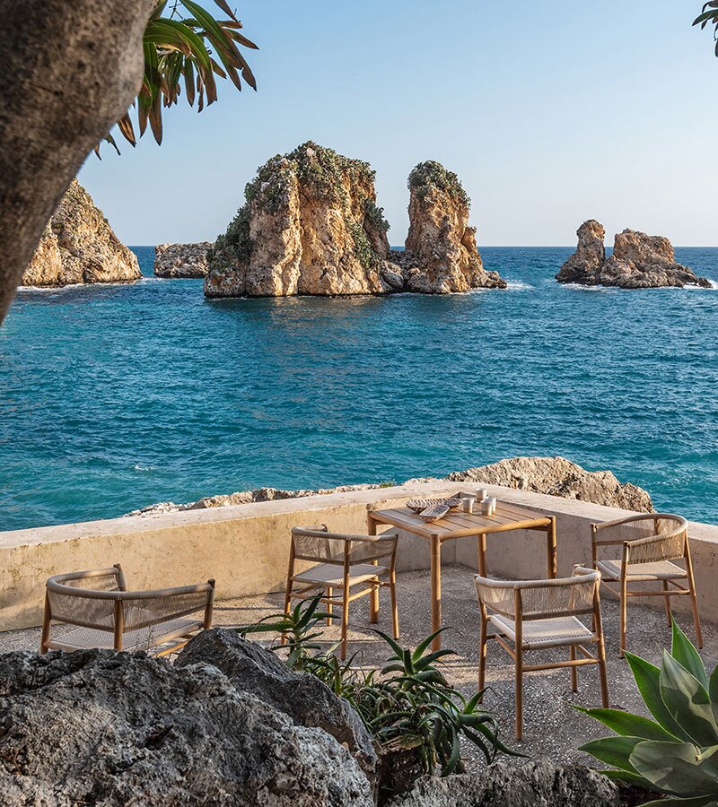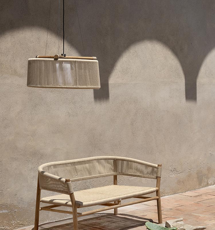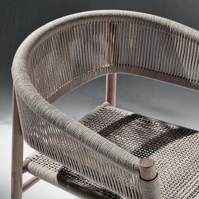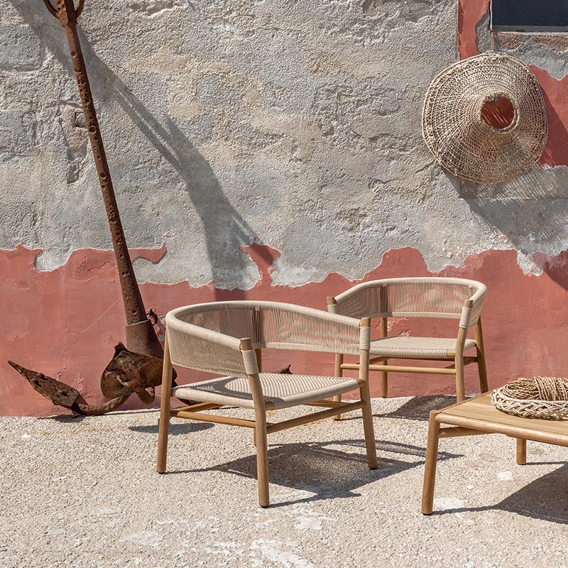 Kilt collection is versatile and can create a cozy and welcoming atmosphere to any space. It is available in teak or stainless steel. The braided rope stretches its thick, soft form to embrace the texture of the teak. The armchair is presented in two new versions: Olive Green and Ruby Wine to furnish outdoor spaces with personality and create unique settings through color.