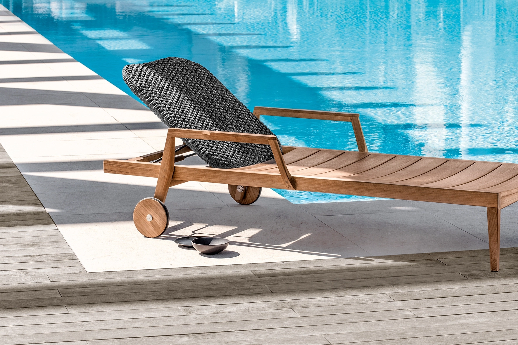 Knit is a complete line of tables, chairs and lounge chairs in teak and woven rope that expresses with refinement a perfect synthesis of aesthetics, functionality and ergonomics. The iconic collection is enriched by the new version in pickled teak and light gray rope and the rocking version of the lounge chair with high back, thus offering a new and special interpretation of the classic bergère.