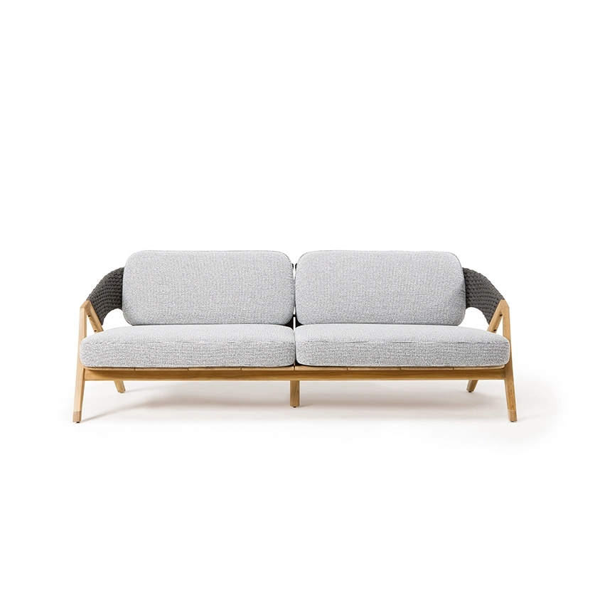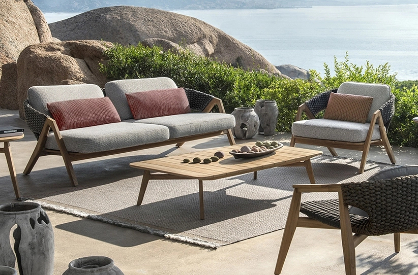 Knit is a complete line of tables, chairs and lounge chairs in teak and woven rope that expresses with refinement a perfect synthesis of aesthetics, functionality and ergonomics. The iconic collection is enriched by the new version in pickled teak and light gray rope and the rocking version of the lounge chair with high back, thus offering a new and special interpretation of the classic bergère.