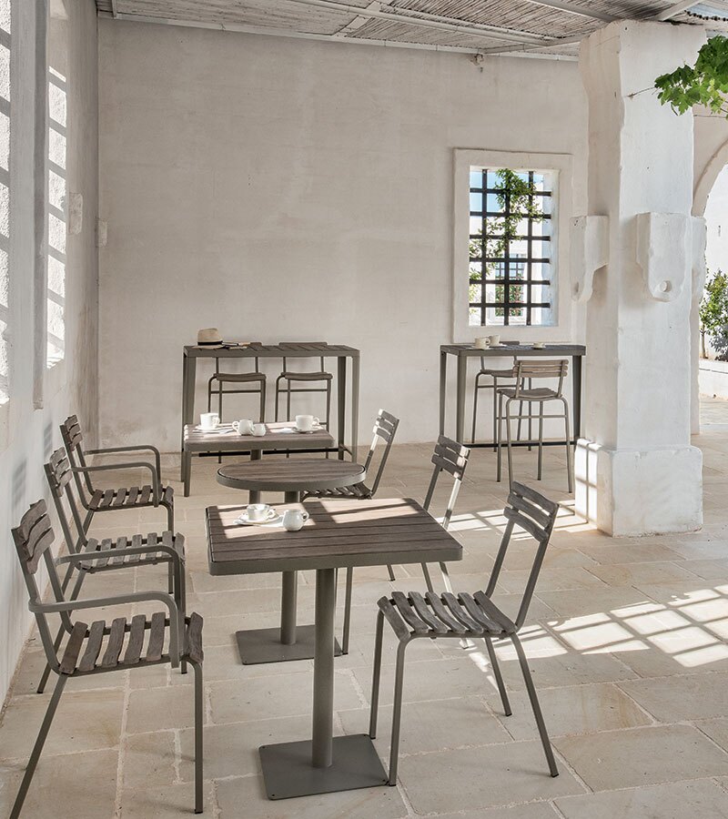 Refined details that characterize the tables, chairs and bistro stools make the Laren collection perfect in a residential garden as well as in outdoor environments with a contemporary and minimal character.