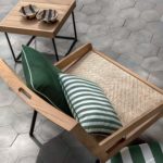 Allaperto Mountain Tartan collection proposes elements featuring a coffee-coloured metal structure clad in natural teak and Ethitex technical fabric with a tartan design.