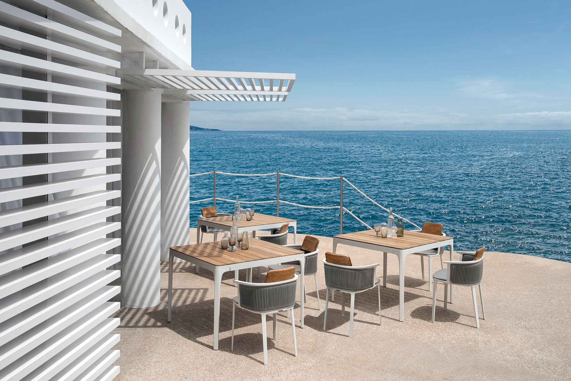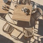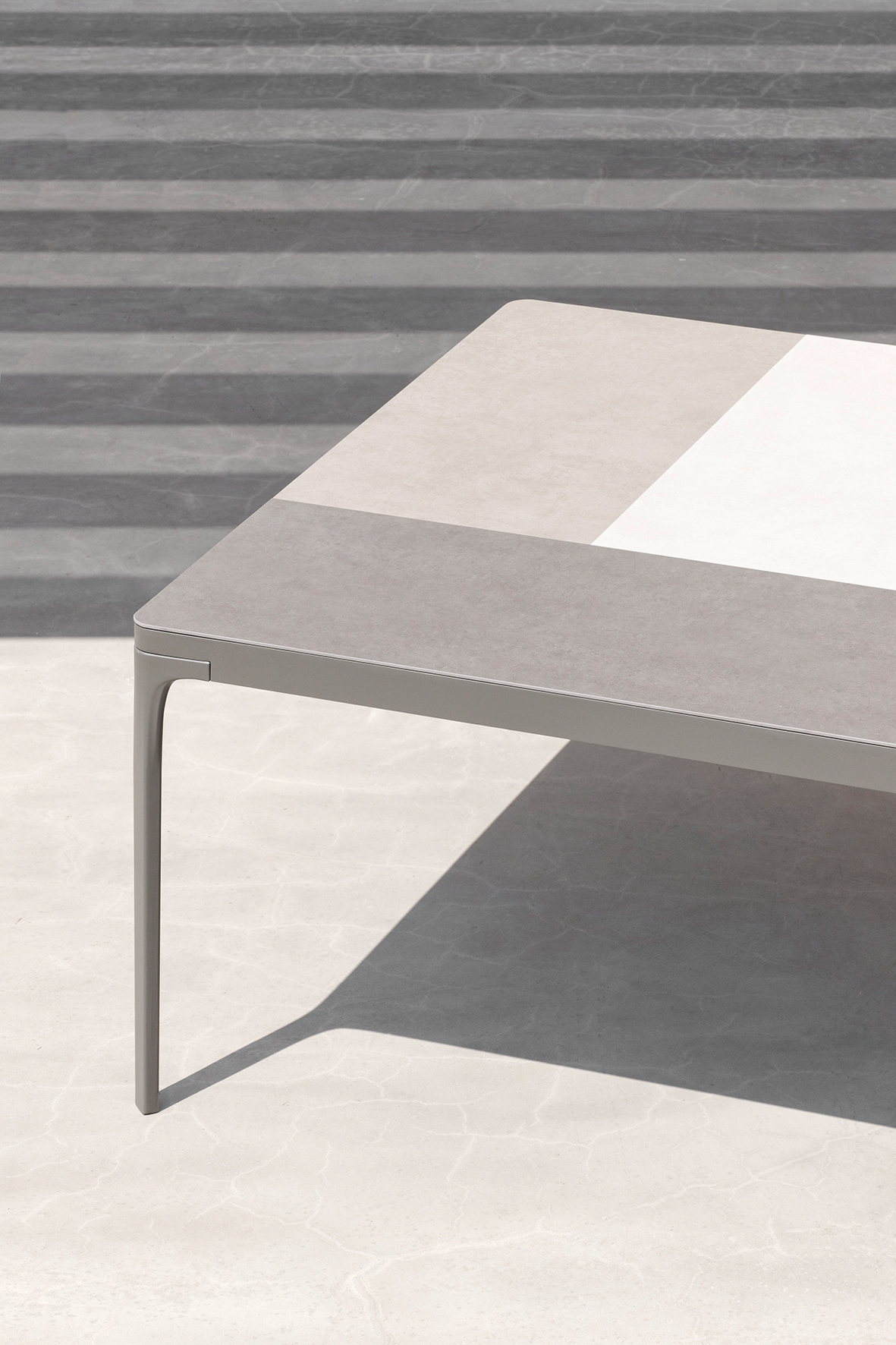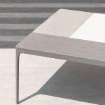 Play tables offer the chance to play with the sizes and varieties of materials that make up the top: painted aluminum, natural, porcelain tile with a stone effect or a special textured finish. Thought up for versatile mixing and matching with other products in the Ethimo collection, they are suitable for any need in the home or contract sector.