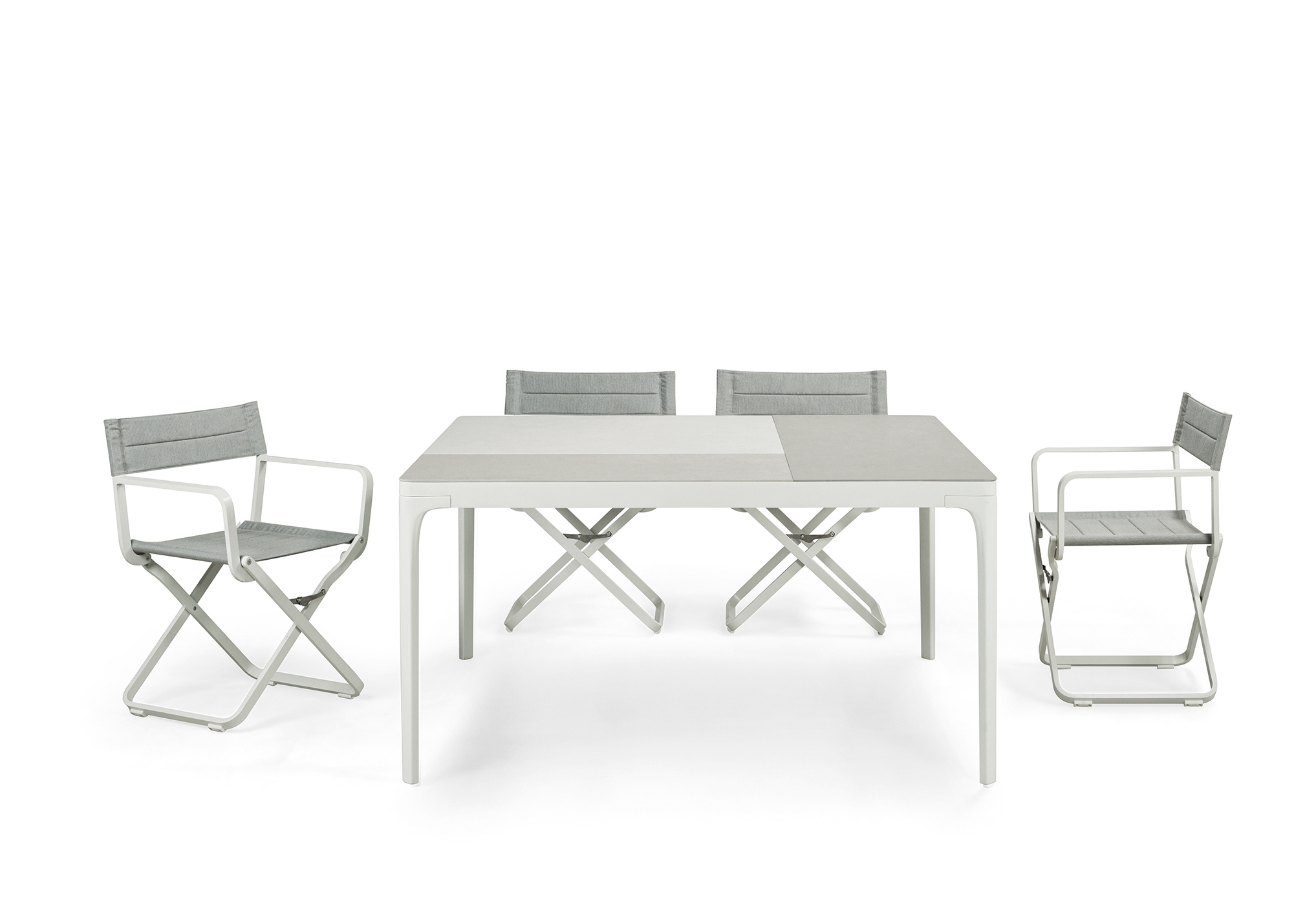 - Top is available in Powder Coated Aluminum, Warmwhite or Warmgrey; Slatted Natural Teak; or Ceramic Stone in Ice White, Graphite, or Disegno colors.