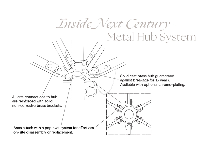 Giati’s Next Century umbrellas are among the most durable on the market. The streamlined look and thoughtful engineering guarantee top of the line performance, even in the most demanding hospitality environments. Our Next Century cast brass hubs are guaranteed for 15 years of regular use, and are available in classic brass color or with added chrome-plated finish.