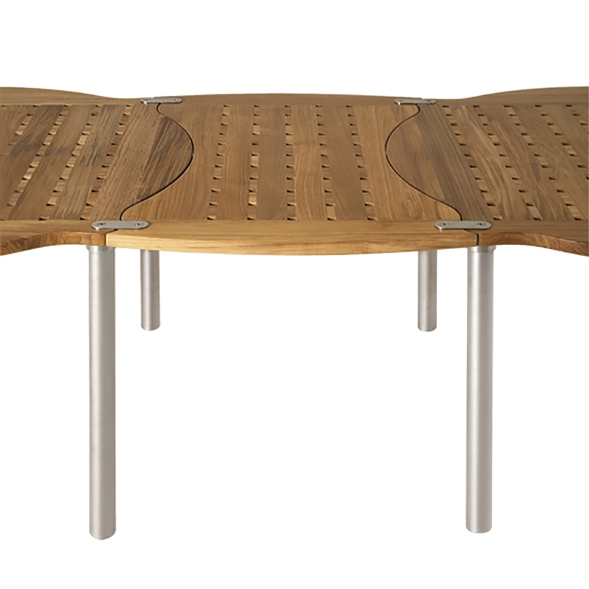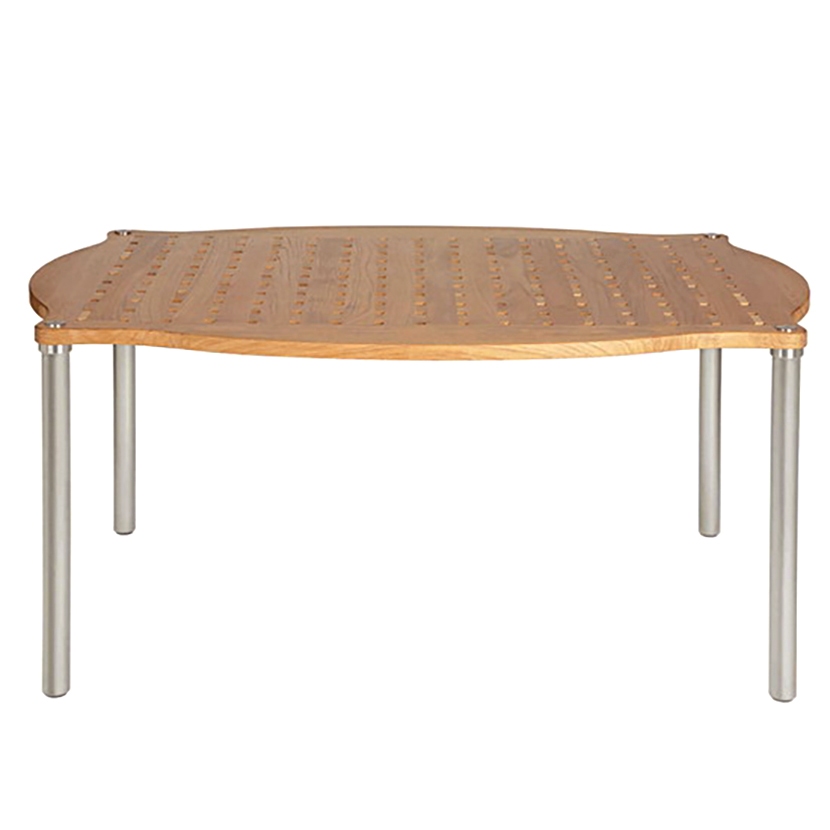 - With nautically inspired hatch top joinery of burnished teak and a stainless steel framework, the table is custom-configured for exceptional resilience and stability.
