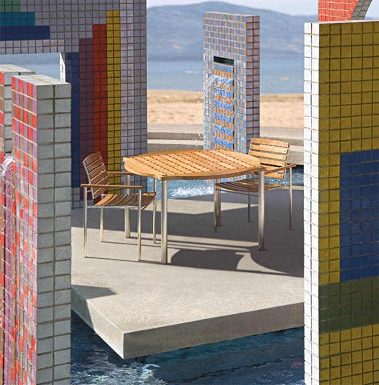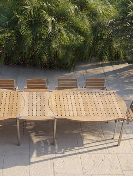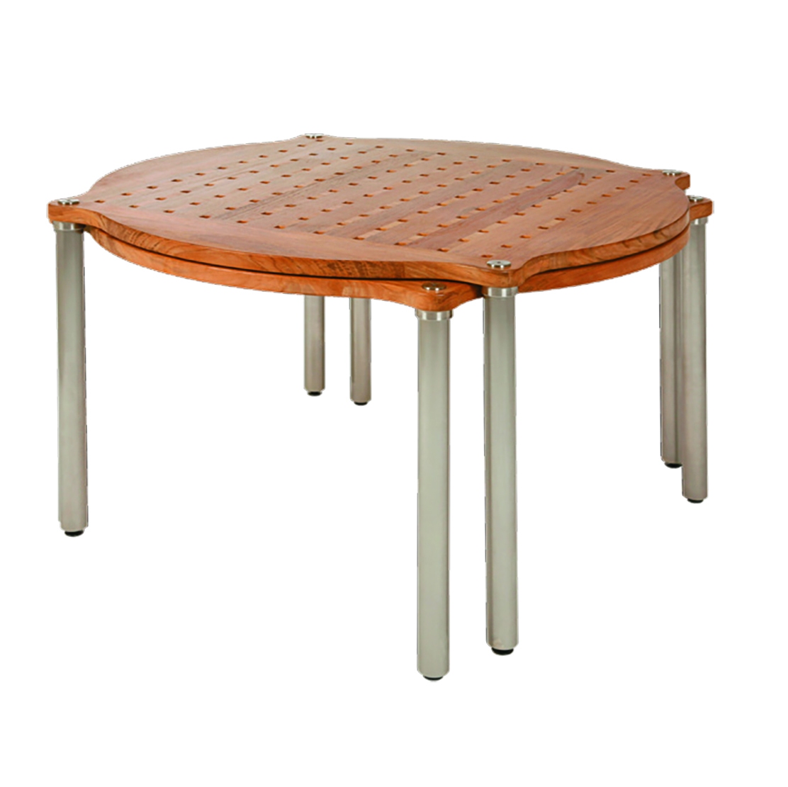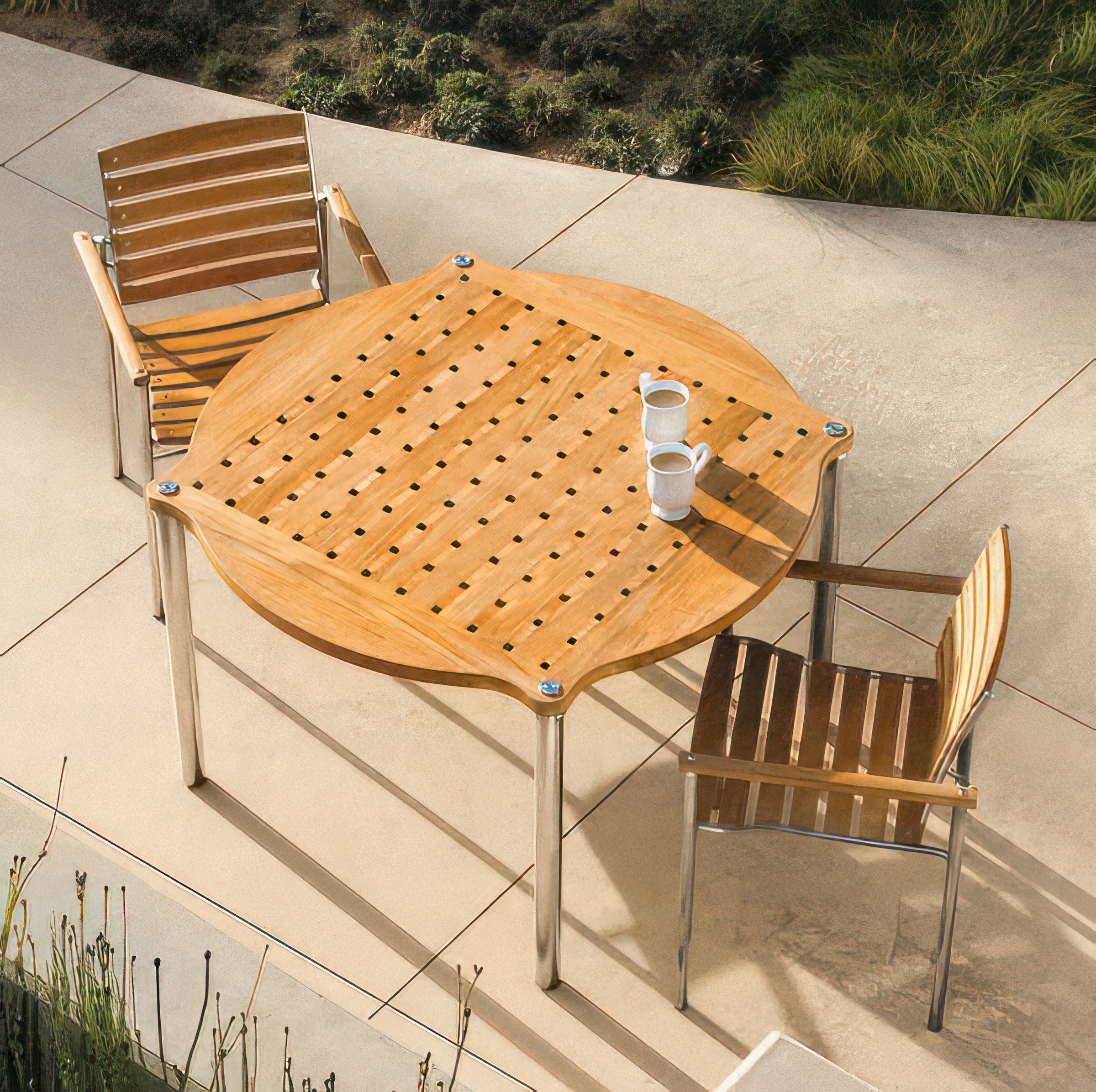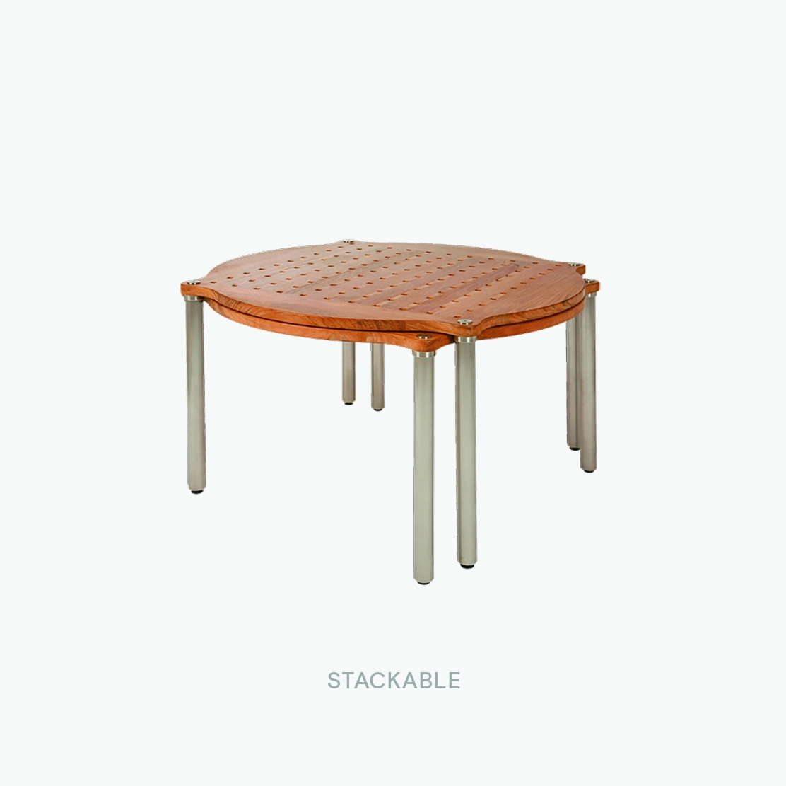 An artistic blend of geometric lines and fluid curves, the Fifty Five collection features a nautically inspired hatch top joinery of burnished teak for exceptional resilience and stability. Paired with our solid teak Matchmaker, it is possible to connect multiple Fifty Five tables as a solution for large gatherings. The tables stack for convenient storage.