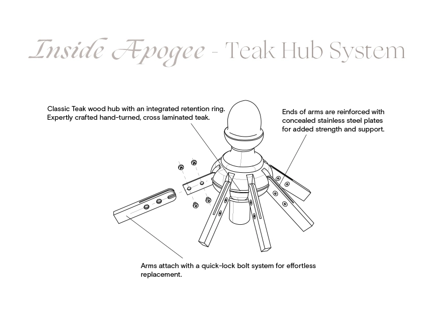 • Apogee umbrellas are defined by their classic teak hub system, hand turned from laminated teak for lasting durability.