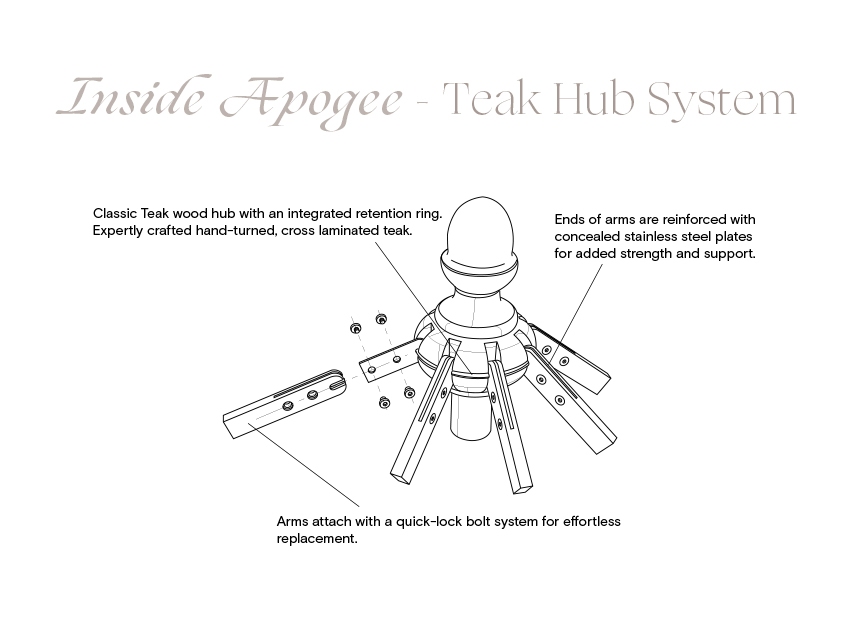 - Apogee umbrellas are defined by their classic teak hub system, hand turned from laminated teak for lasting durability.