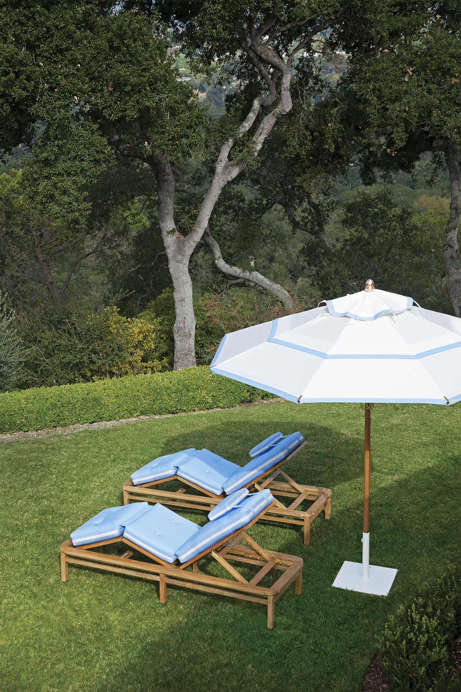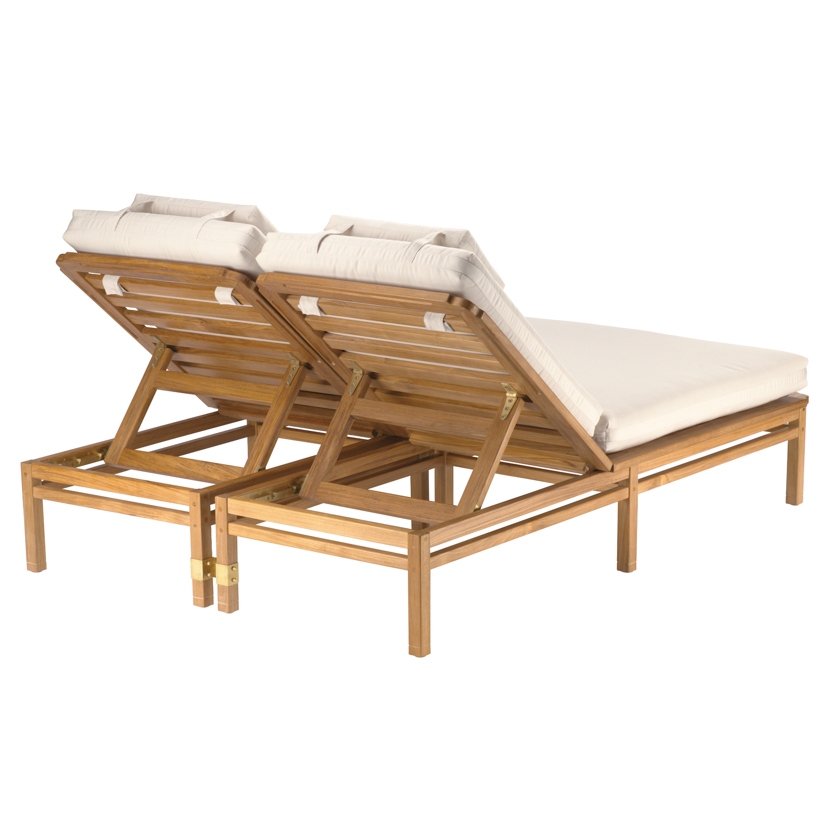 An elegant island of calm. This quintessential chaise adjusts to 21 different positions with an invisible pivot system which provides smooth back and knee adjustment. The chaise is crafted of hand-polished premium teak, with extra- thick cushions for unrestrained comfort. Roscoe Award winner. -