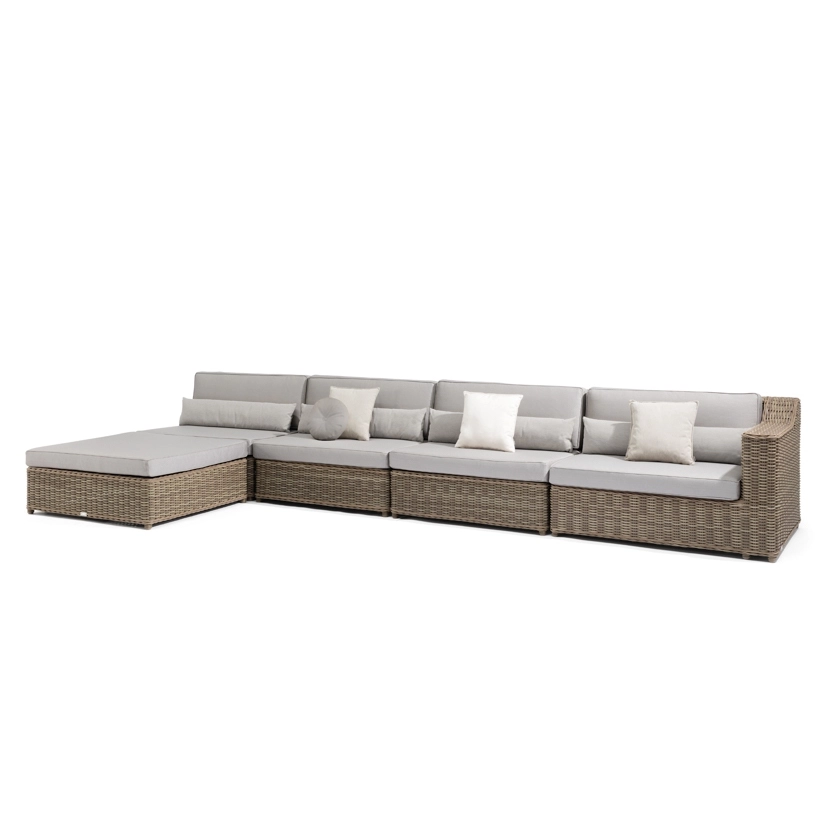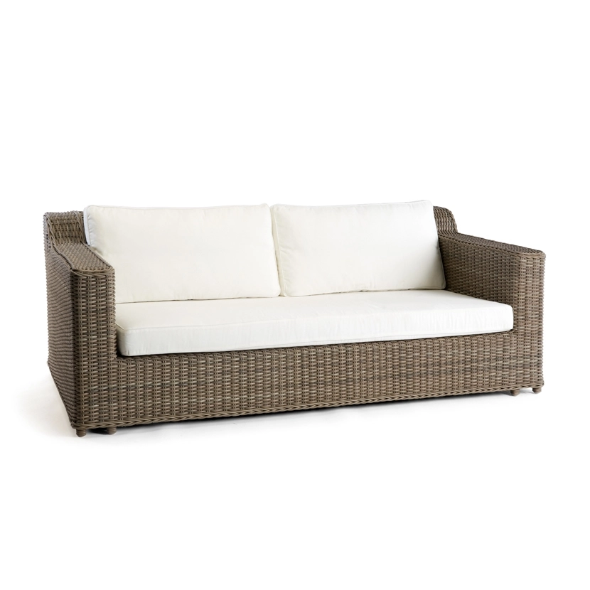 The San Diego collection of tables, chairs, sofas and accessories combines strong water-repellent fabrics and synthetic aged rattan cane work. Designed with a stark, minimalistic eye to detail, each piece also includes the softer, organic appeal of wicker. Natural materials and tones add to the collection’s ageless appeal.