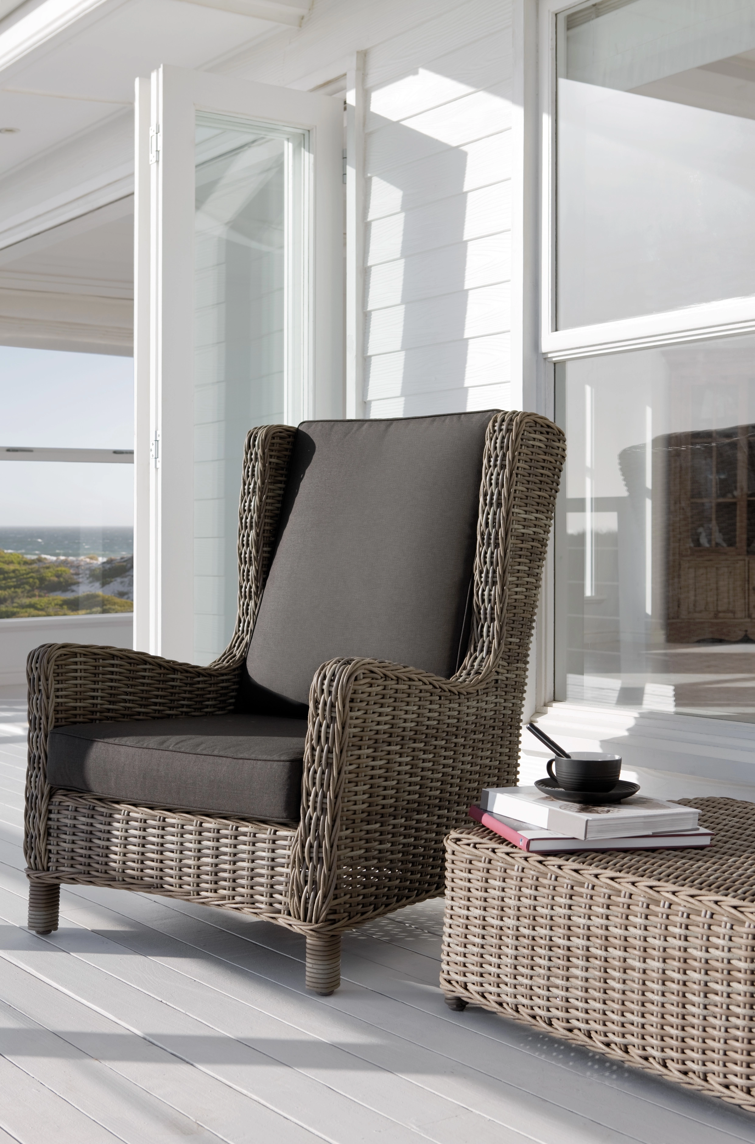 The San Diego collection of tables, chairs, sofas and accessories combines strong water-repellent fabrics and synthetic aged rattan cane work. Designed with a stark, minimalistic eye to detail, each piece also includes the softer, organic appeal of wicker. Natural materials and tones add to the collection’s ageless appeal.