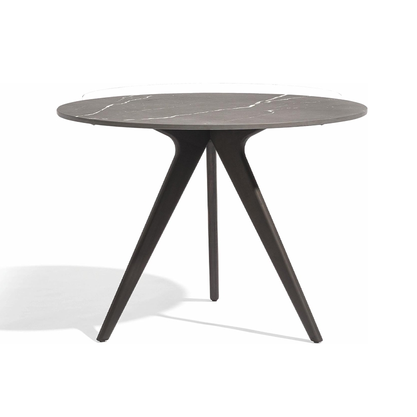 - Round shaped ceramic table with rounded corners; knock-down design; black adjustable feet.