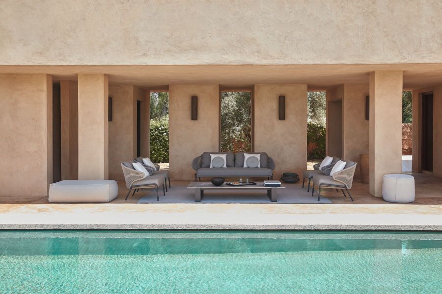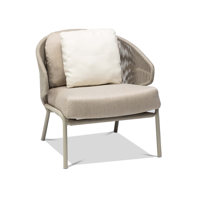 The unique, airy design of the Radoc chair, footstool, lounge chair and sofa collection is perfect for exquisite moments of warmth and closeness. The wrap-around back and armrests, made entirely out of rope, blend seamlessly and give each piece a neomodern yet timeless look and feel. Keep it sober or opt for matching backrest cushions designed for optimal seating comfort for long get-togethers.