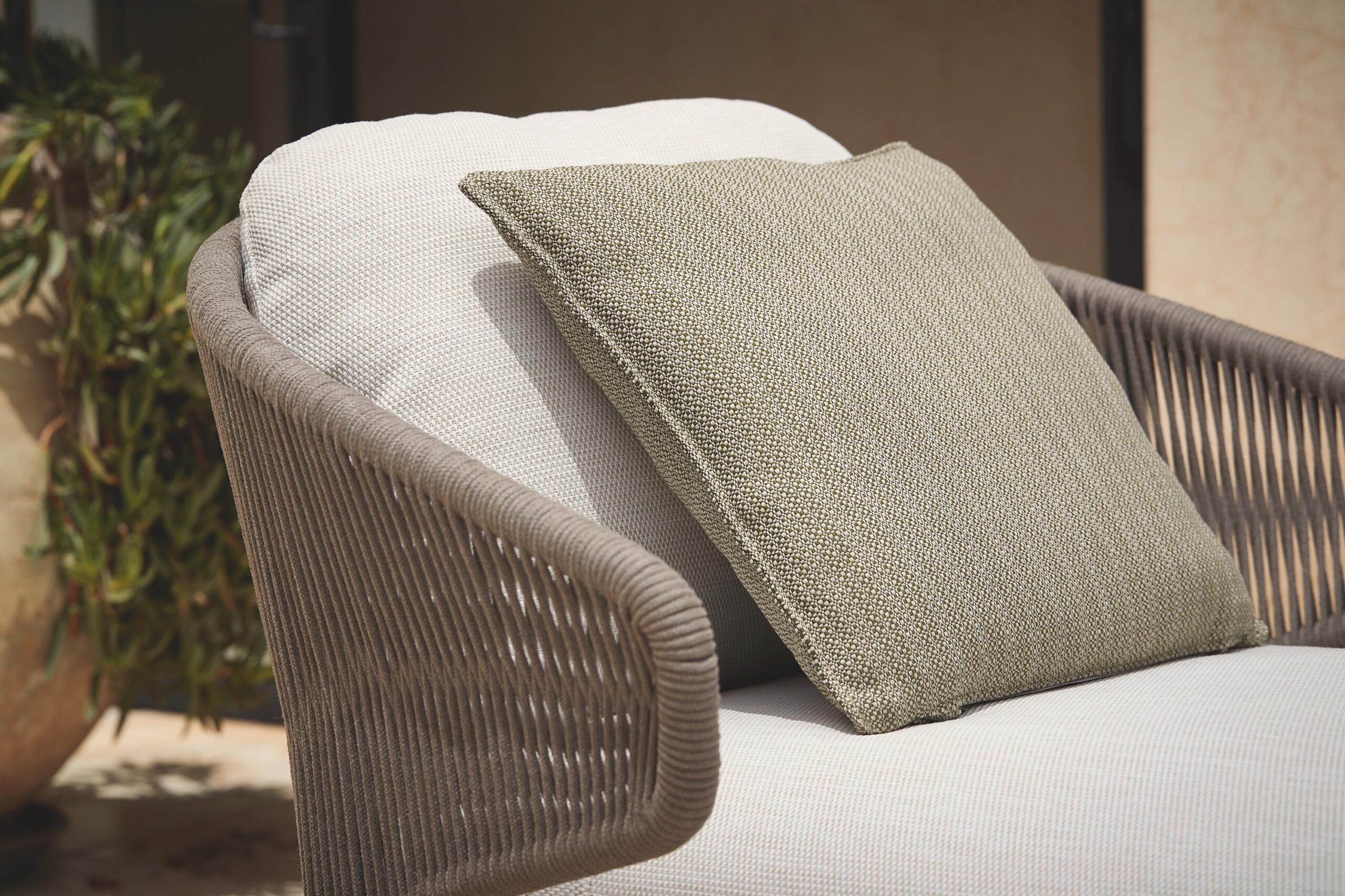The unique, airy design of the Radius chair, footstool, lounge chair and sofa collection is perfect for exquisite moments of warmth and closeness. The wrap-around back and armrests, made entirely out of rope, blend seamlessly and give each piece a Neo modern yet timeless look and feel.