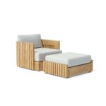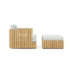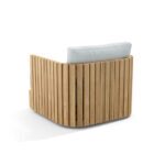 The Bay collection exudes sophistication, elevating any outdoor space with its curved design. Meticulously fashioned from high-quality solid teak, every piece is adorned with striking vertical wooden slats, thoughtfully crafted to effortlessly complement the collection’s bold contours. Delight in unmatched comfort and durability with the generously-sized seat cushions, fashioned from exquisite performance fabrics by Giati Elements.