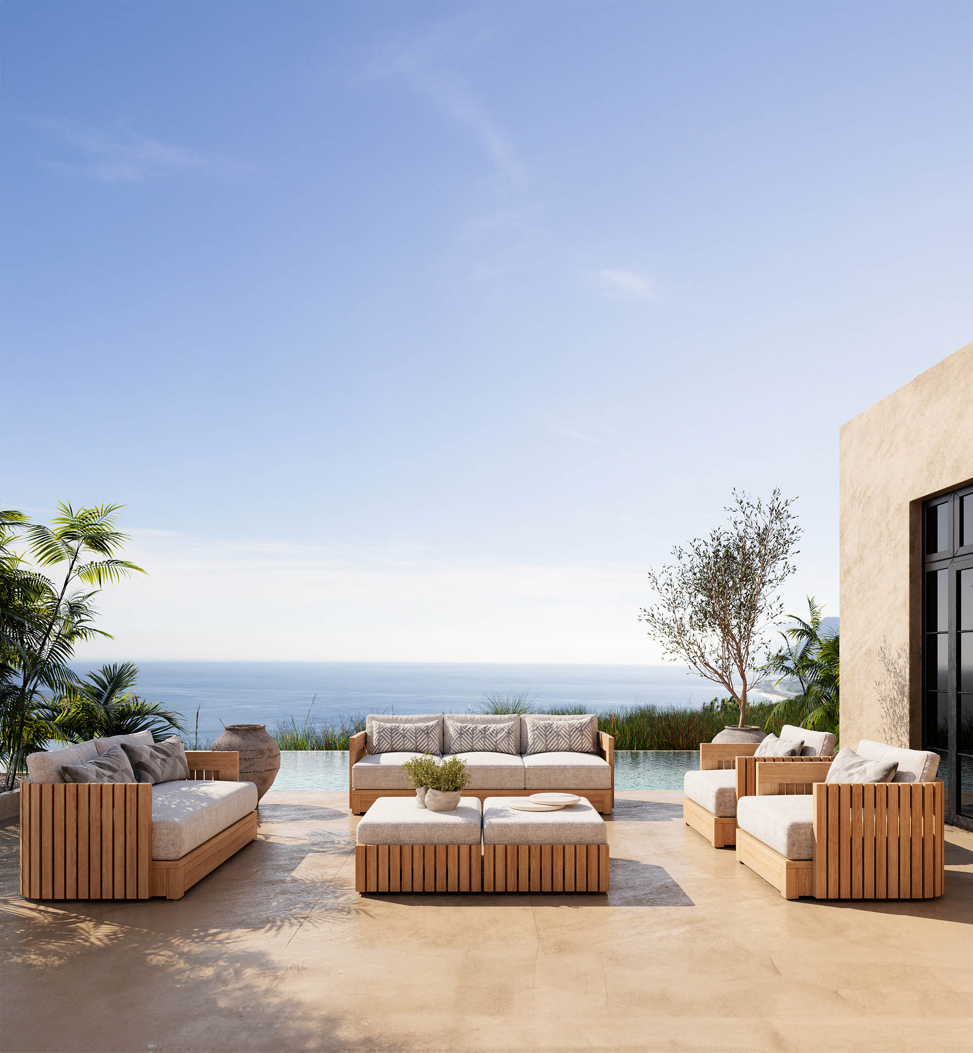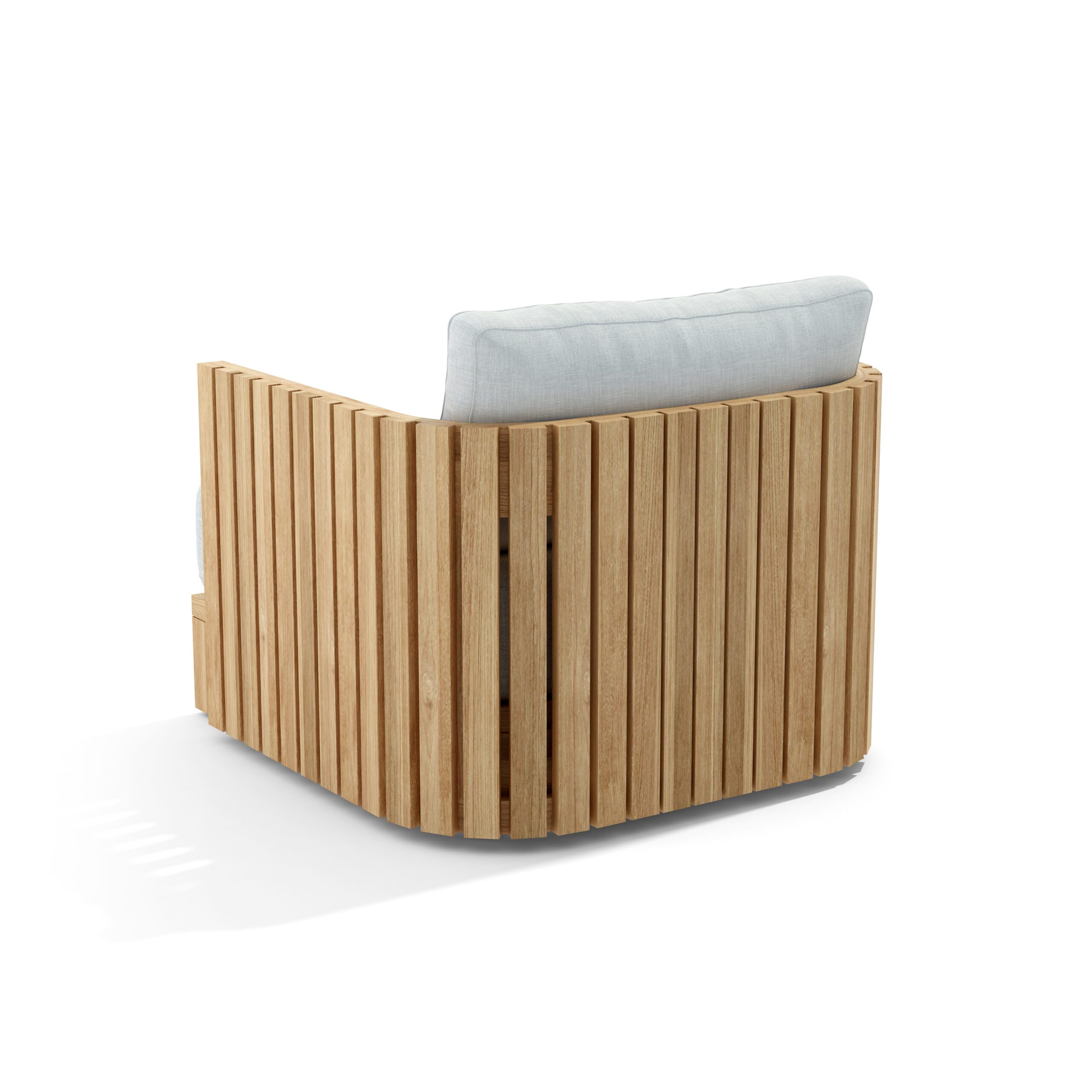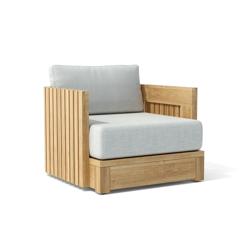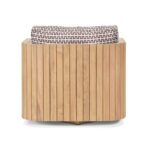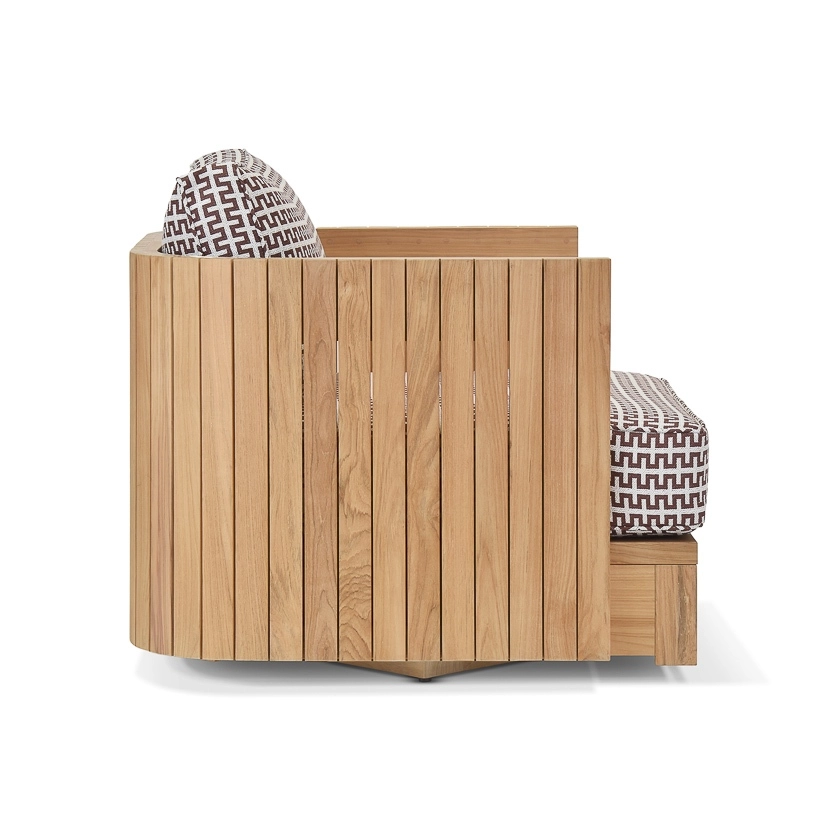 The Bay collection exudes sophistication, elevating any outdoor space with its curved design. Meticulously fashioned from high-quality solid teak, every piece is adorned with striking vertical wooden slats, thoughtfully crafted to effortlessly complement the collection’s bold contours. Delight in unmatched comfort and durability with the generously-sized seat cushions, fashioned from exquisite performance fabrics by Giati Elements.