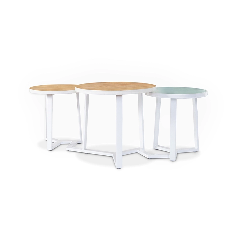 - 2x Ø16 Tabletops, 1x Ø20 Tabletop in Natural Teak and Glass