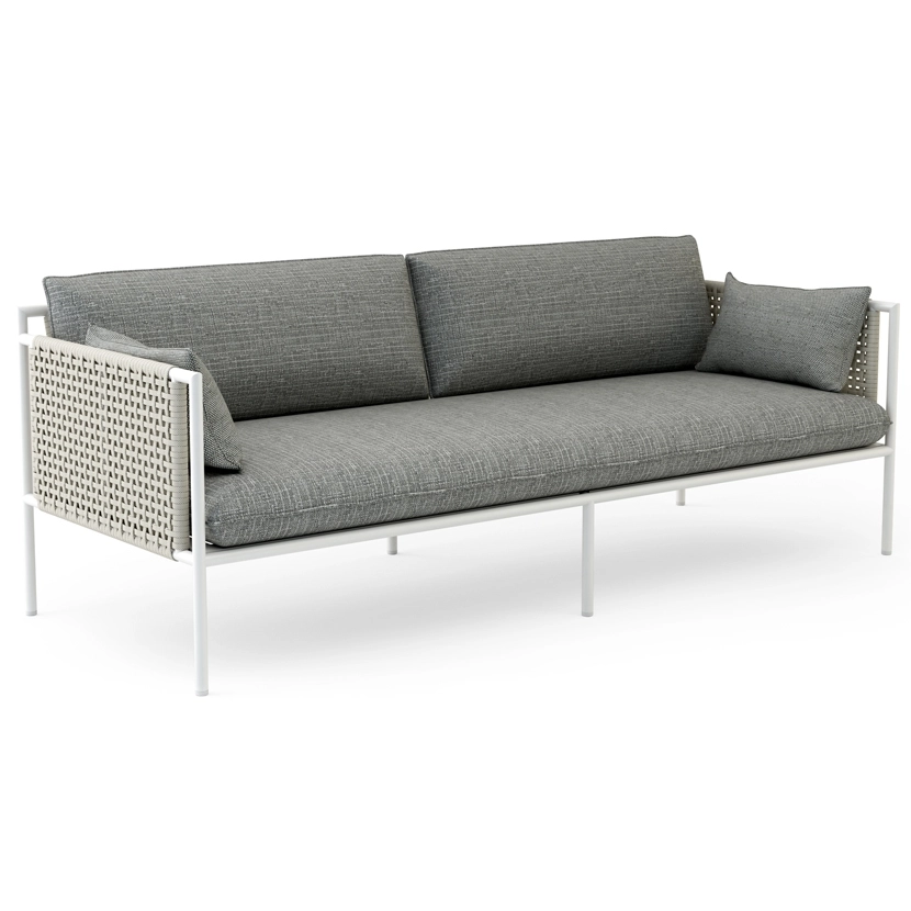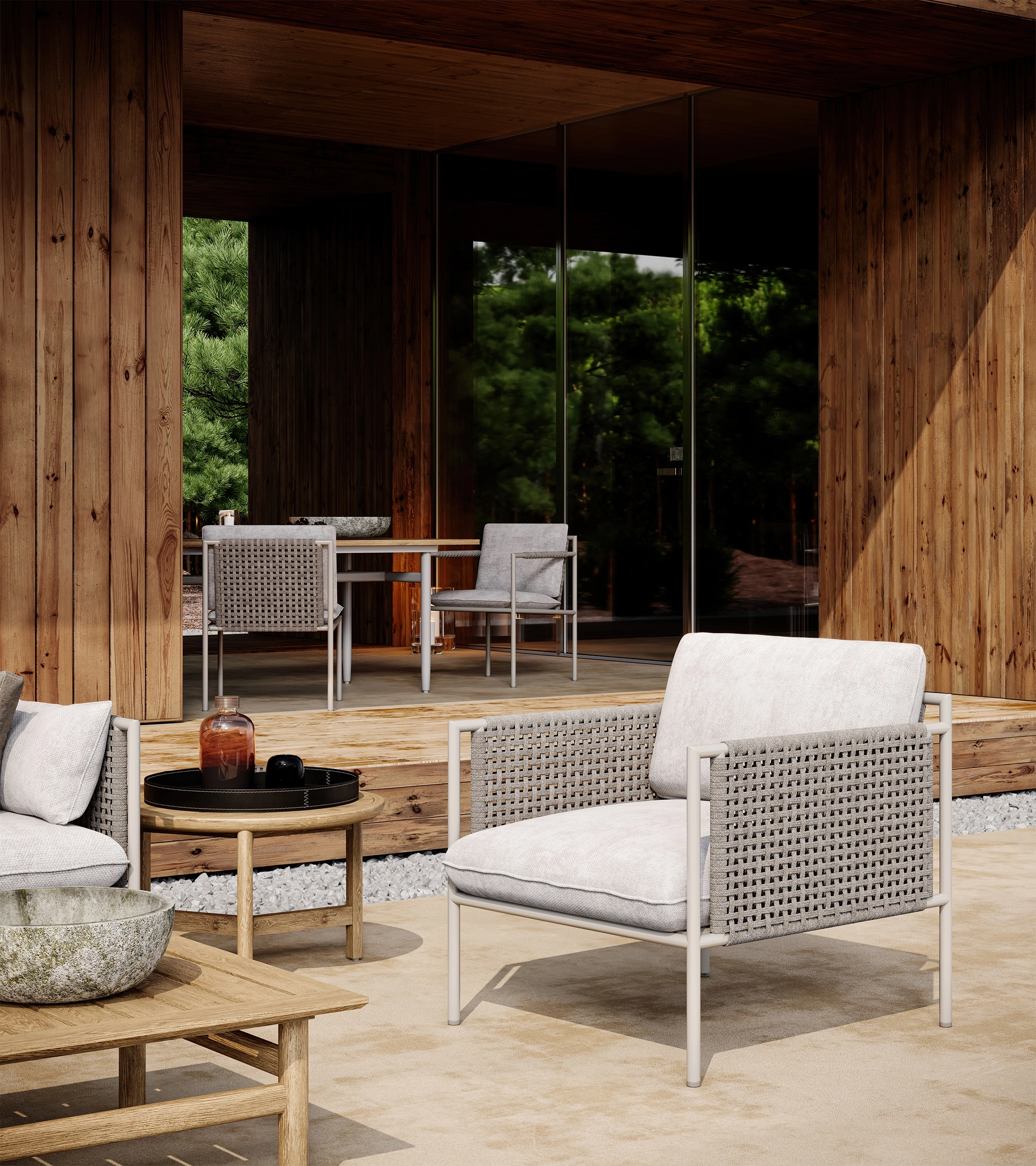 Like the mast of a sailboat, the collection’s reinforced powder coated aluminum frames and double wall rope-pane structures marry the lasting strength of metal with the trusted hand of knotted rope.