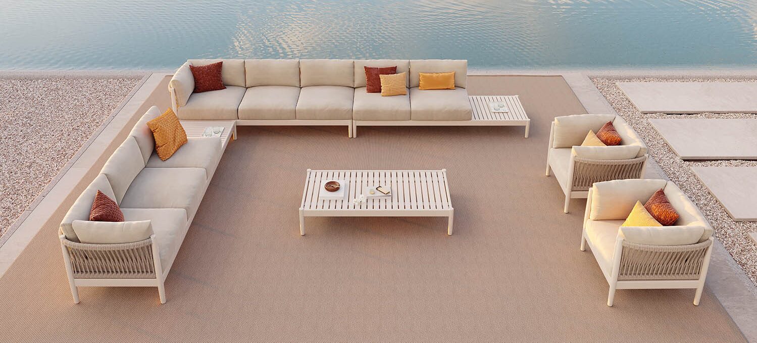 With remarkable comfort and elegant styling, the Georgica lounge collection invites you to sink in. Constructed from durable powder coated aluminum, subtle curves complement contrasting woven rope panels. Georgica is offered as a sectional sofa allowing a variety of planning configurations.